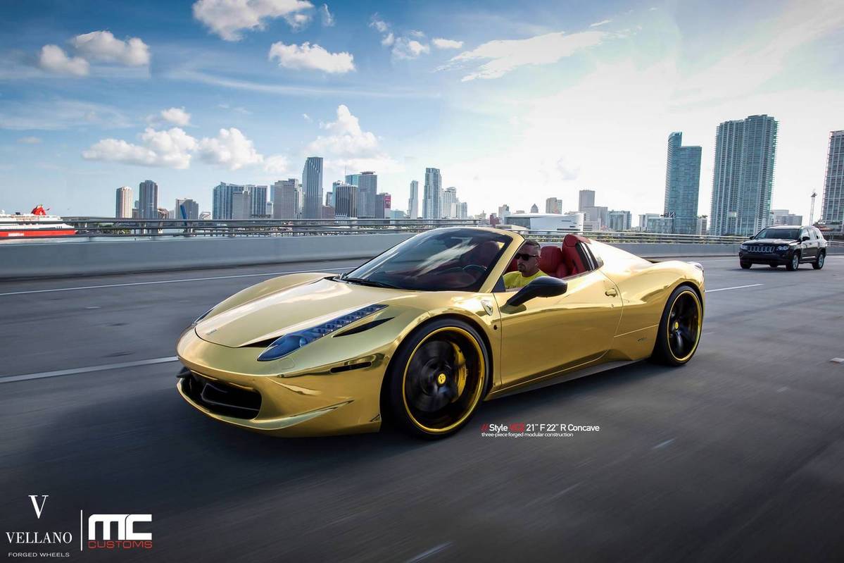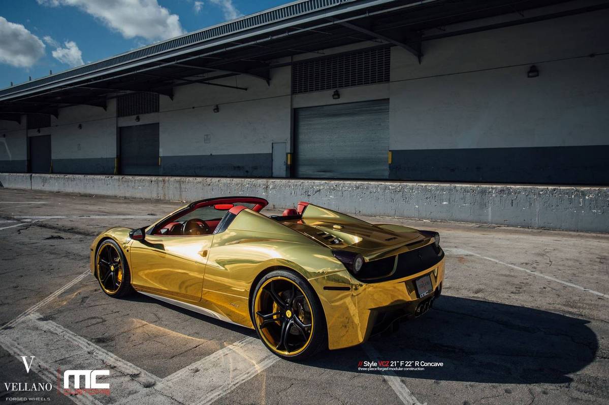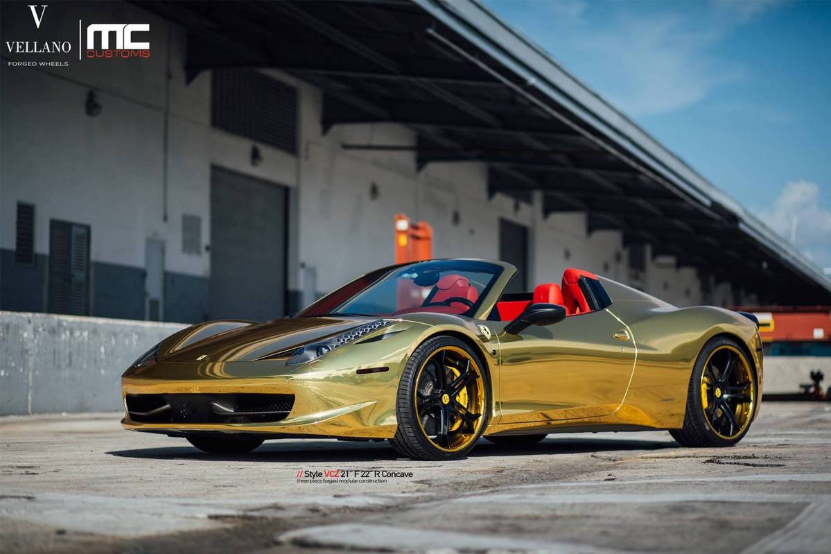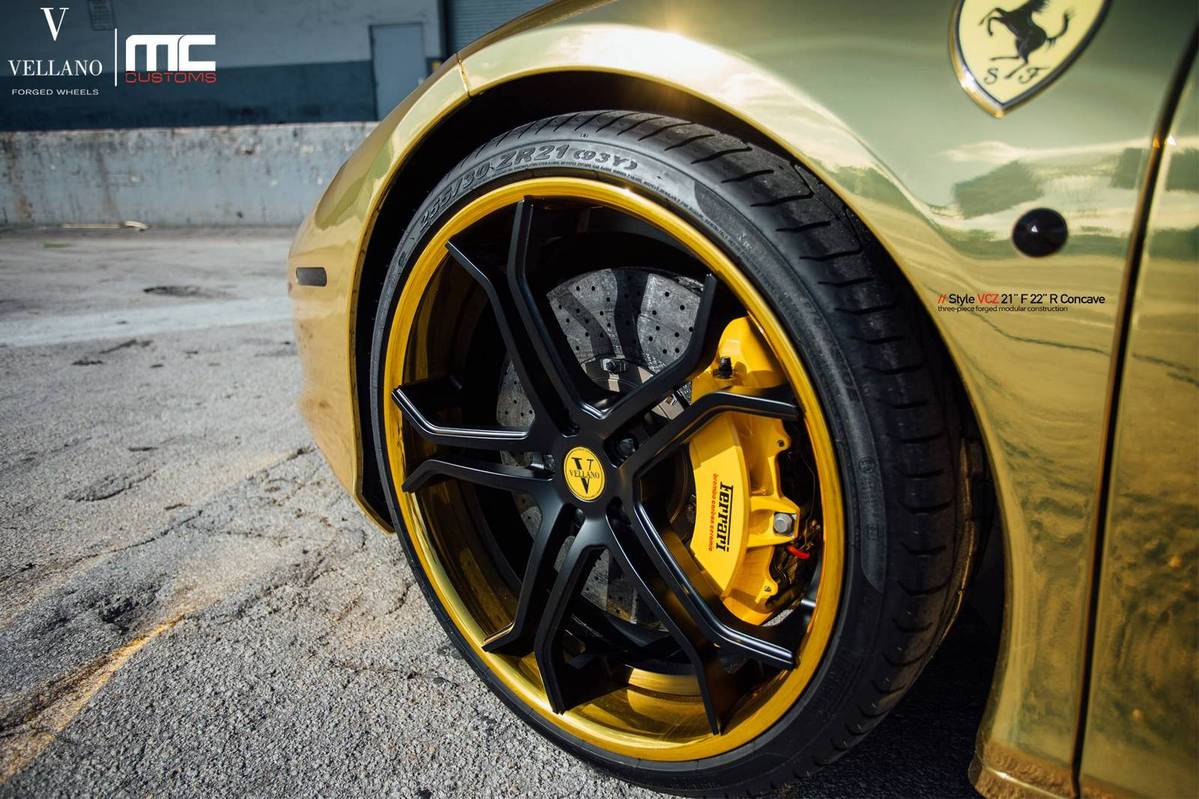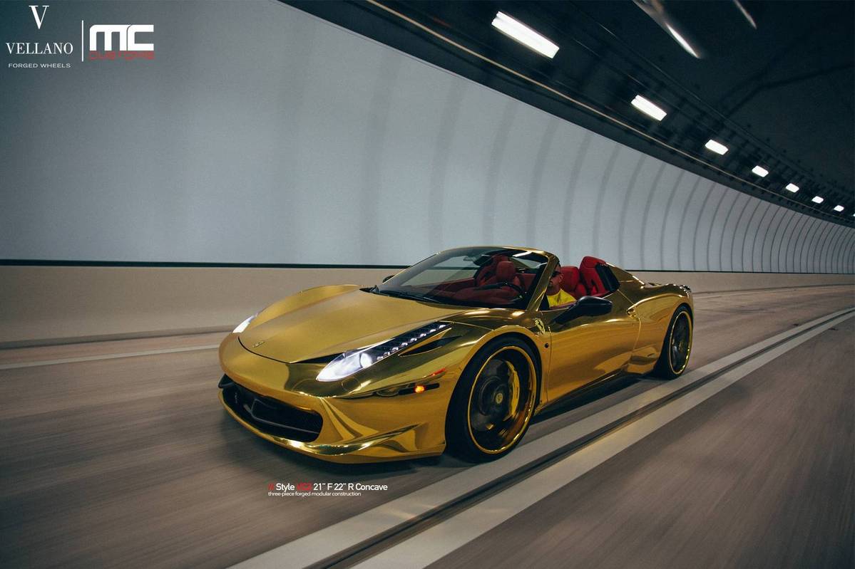 今天提供給各位參考的是眼前這台採用全車電鍍金色貼膜的Ferrari 458 Spider敞篷車,選用輪圈品牌Vellano Wheels、型號VCZ的輕量化輪圈,尺寸為前21x9.0J、後22x11.0J的前後配設定,中心以消光黑色塗裝,外圈則以呼應車身的金色處理,再透過Novitec短彈簧的換裝將車身降低,配上原廠選配的紅色真皮內裝,吸睛度可謂百分百!