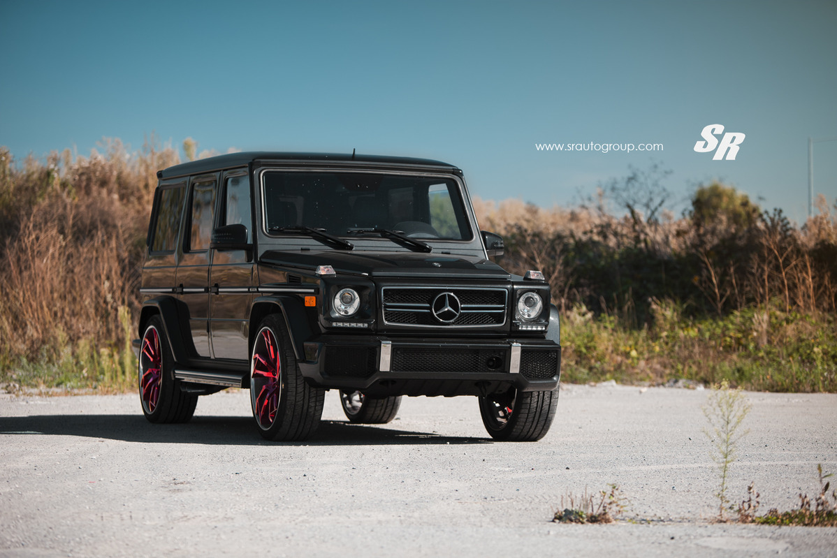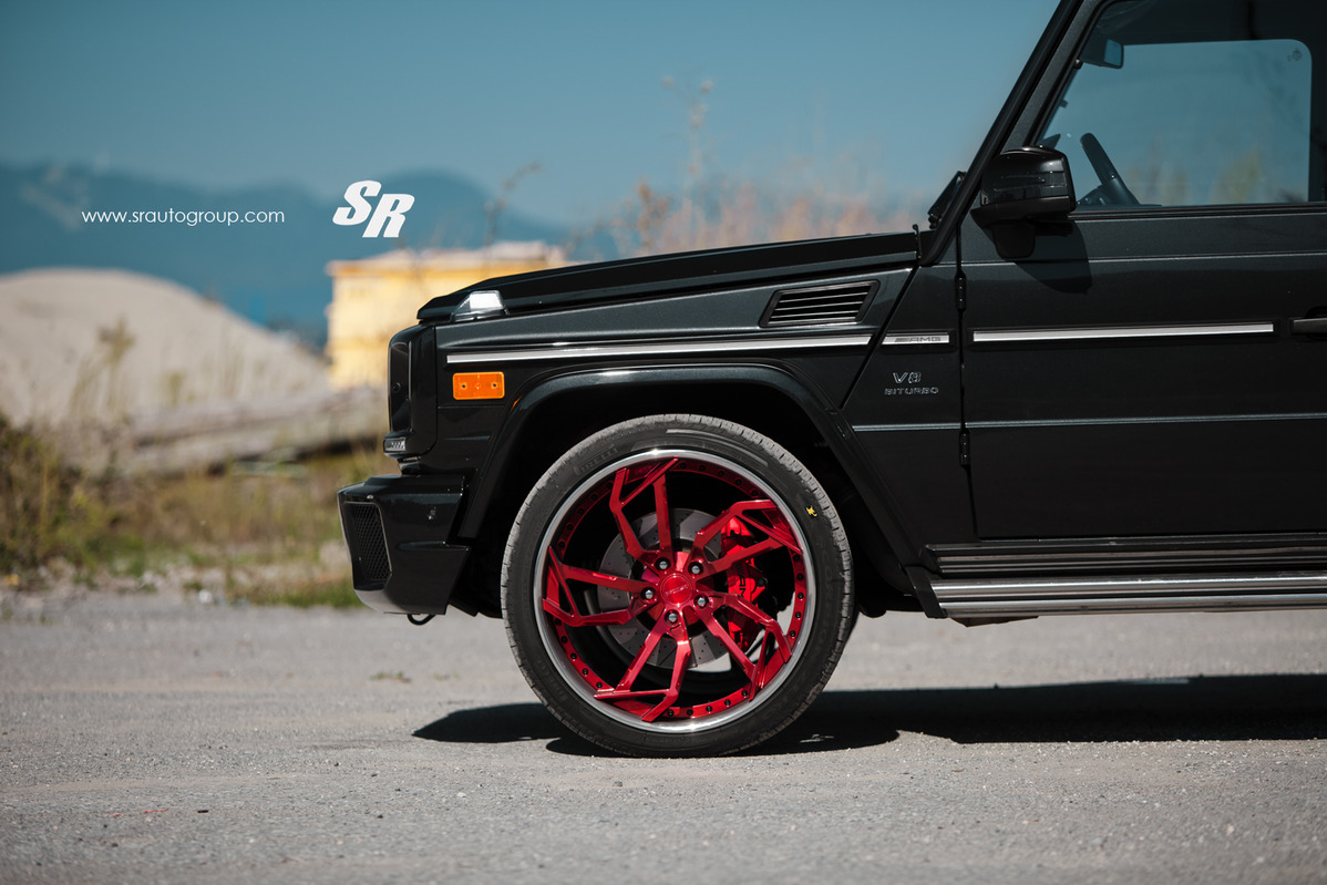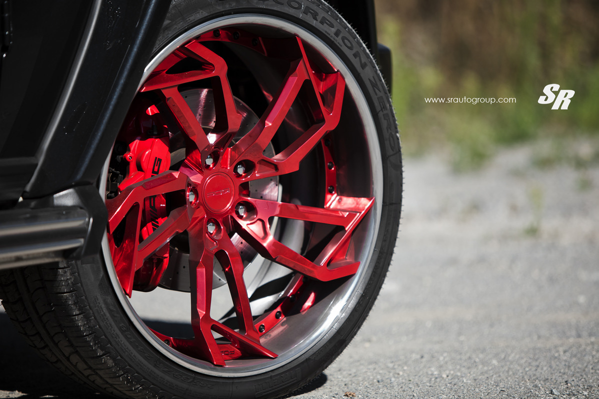 今天帶給各位一部由改裝廠SR Auto Group所操刀的黑色塗裝Mercedes Benz G63 AMG,選用PUR Wheels、型號LX12的輕量化輪圈,四輪皆採用24x10J的龐大尺寸,大J數使得輪子往外拓寬不少,而輪圈中心為糖果紅色塗裝,外圈則以拋光處理,另外透過短彈簧的換裝將車身降低約35mm,展現出氣勢磅礡的奢華氛圍。