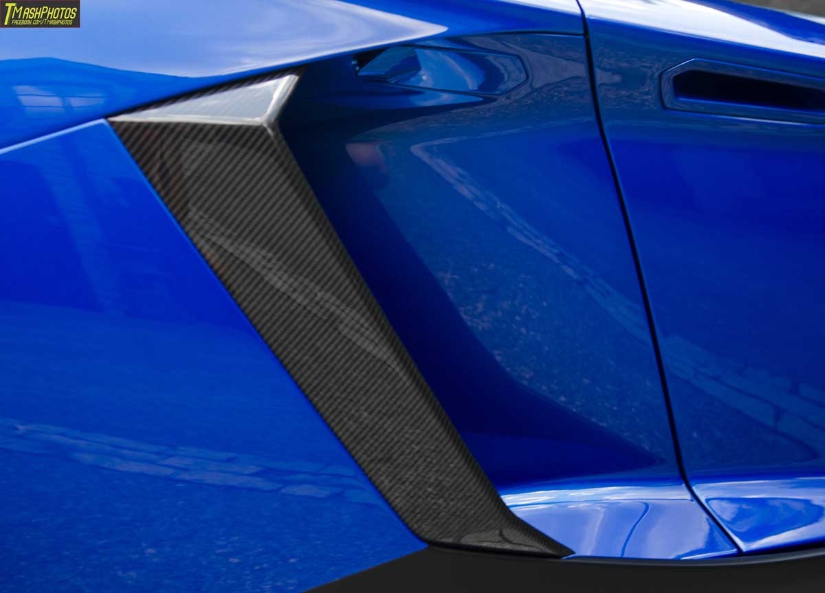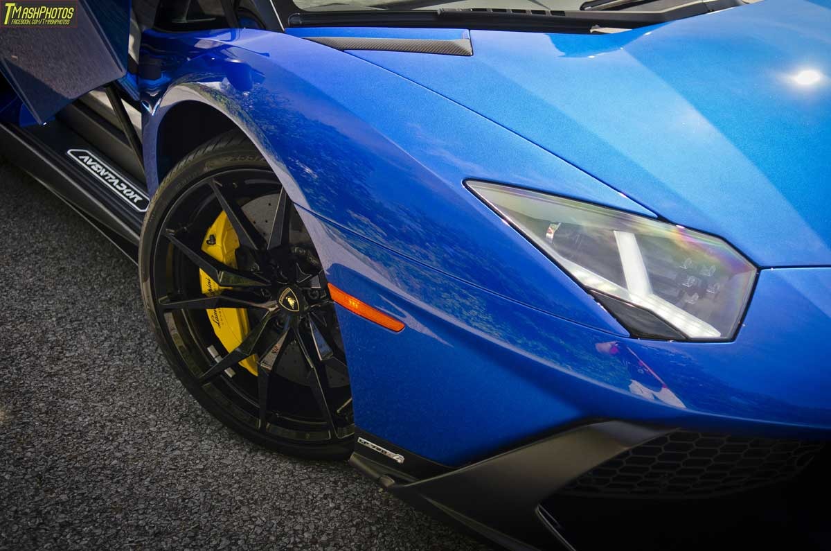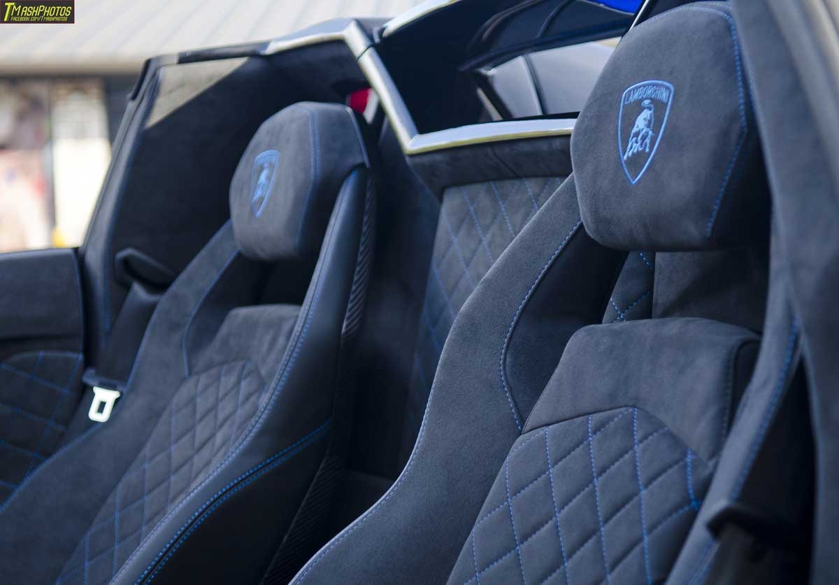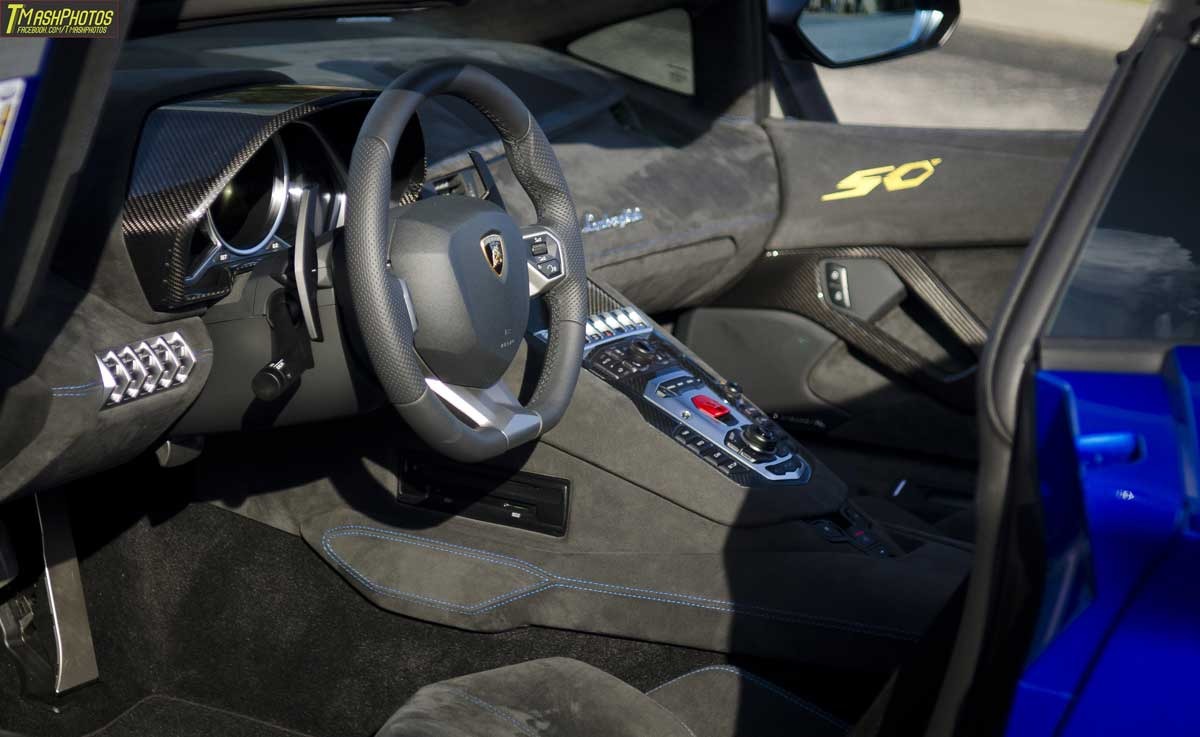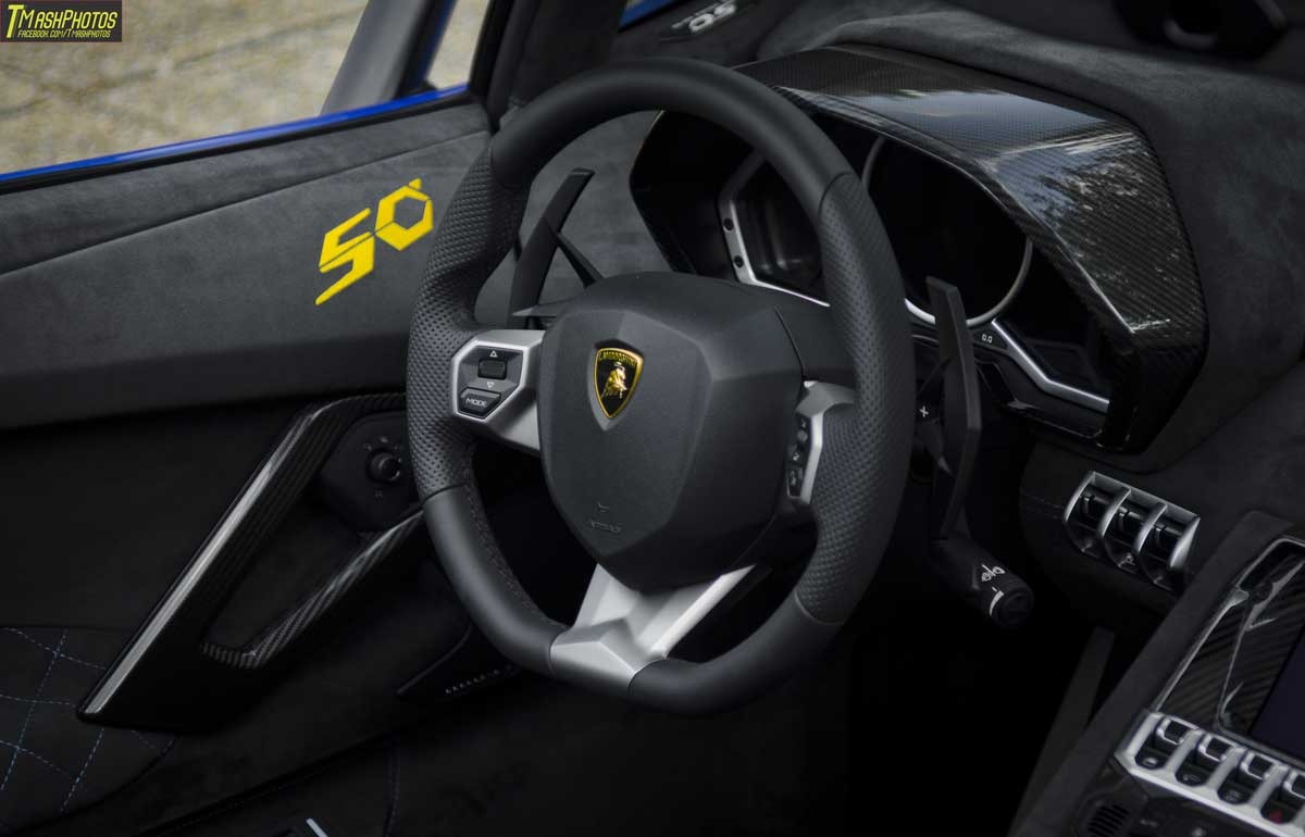 今天要帶給各為一部配色極其特殊的Lamborghini Aventador LP720-4 50° Anniversario,車身採用Blue Nethuns寶藍色塗裝,搭配黃色煞車卡鉗與黑色Dione鍛造輪圈,內裝採用全數麂皮包覆配上藍色車縫線與鮮明的黃色50周年紀念刺繡,同時配有大量原廠碳纖維空力套件,與其餘99部的LP720-4 50° Anniversario相比,極其特別。
