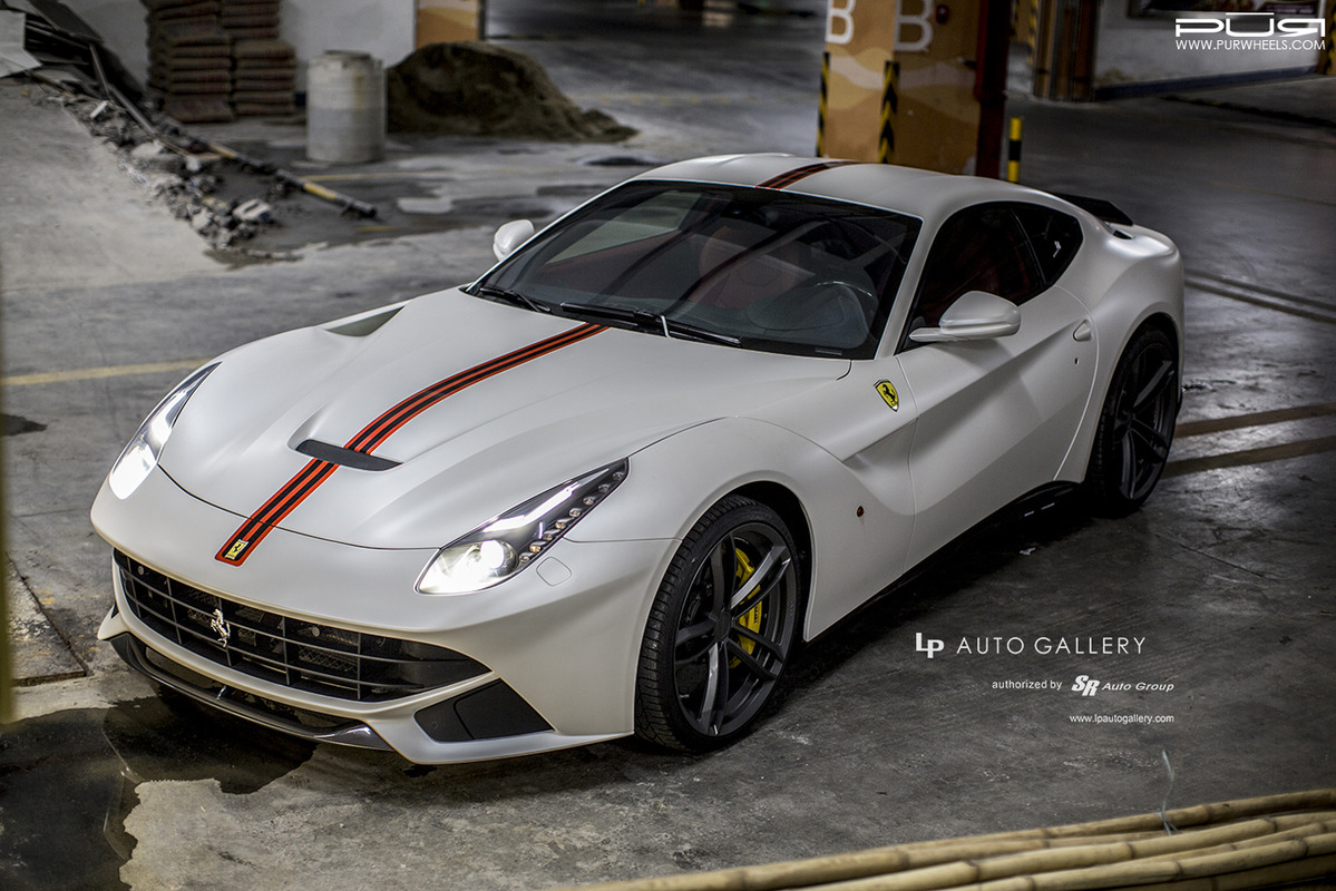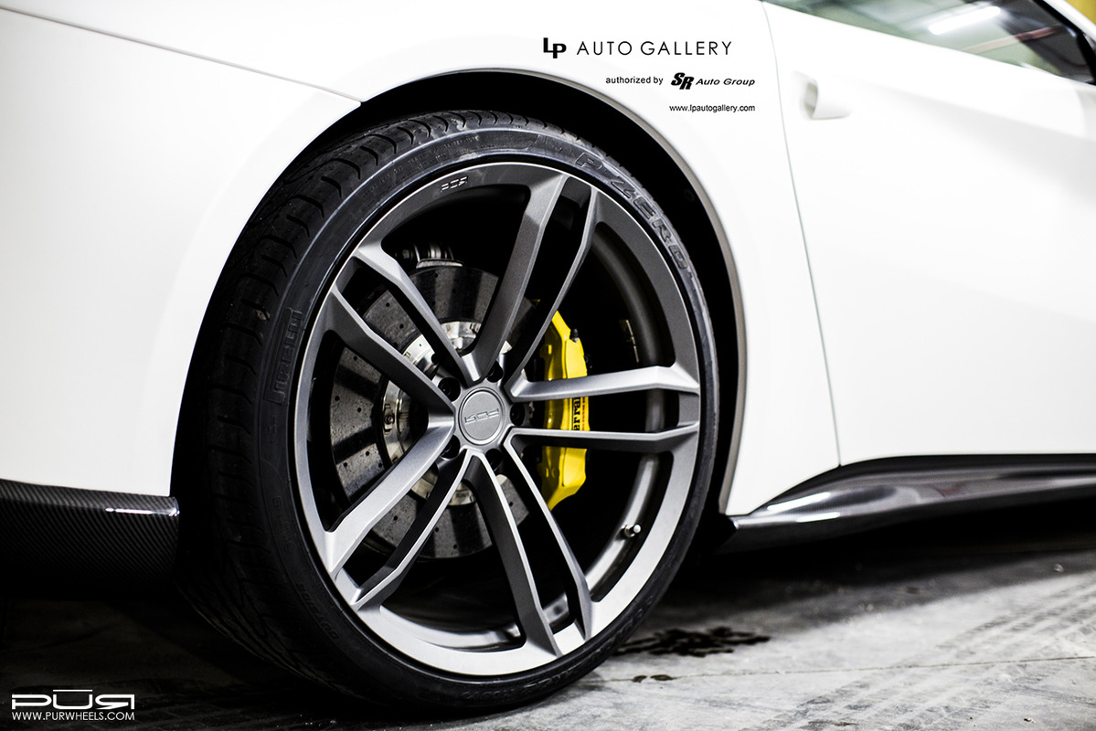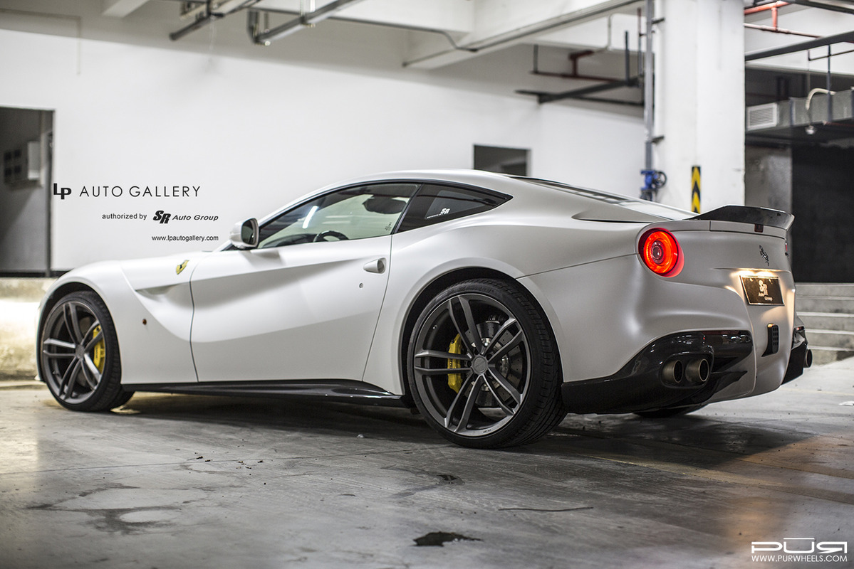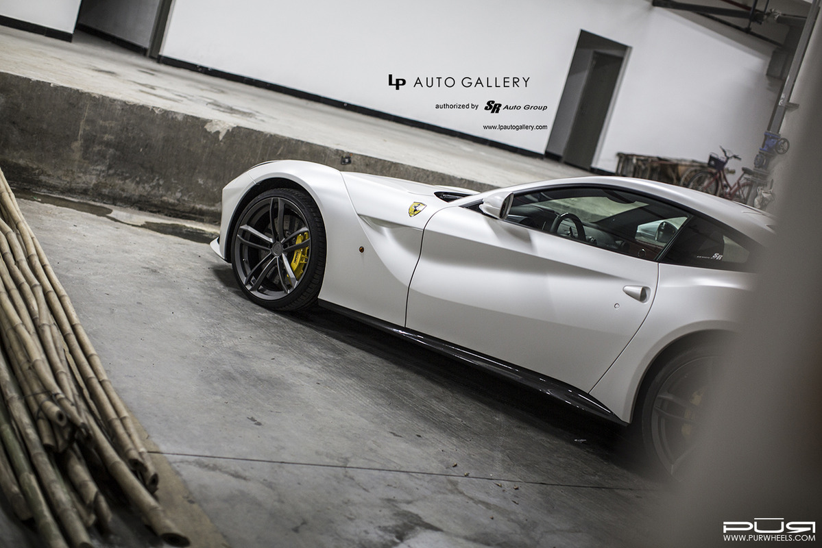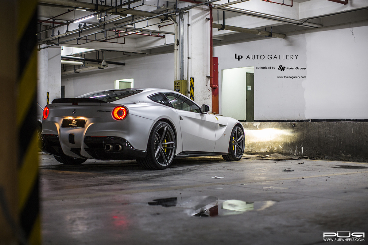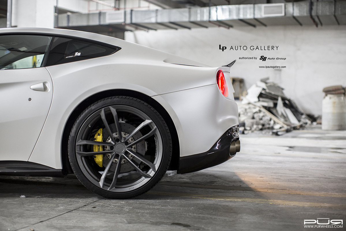 今天帶給各位一部由中國改裝廠LP Auto Gallery所操刀的消光白色Ferrari F12 Berlinetta,選用來自PUR Wheels、型號RS07的單片式鍛造輪圈,尺寸為前21x9J、後22x12J的前後配設定,圈面採用消光槍灰色塗裝,搭配貫穿前後的車身飾條、簡單俐落的後鴨尾翼與黃色煞車卡鉗等部品,讓這部V12超跑旗艦更顯磅礡質感。