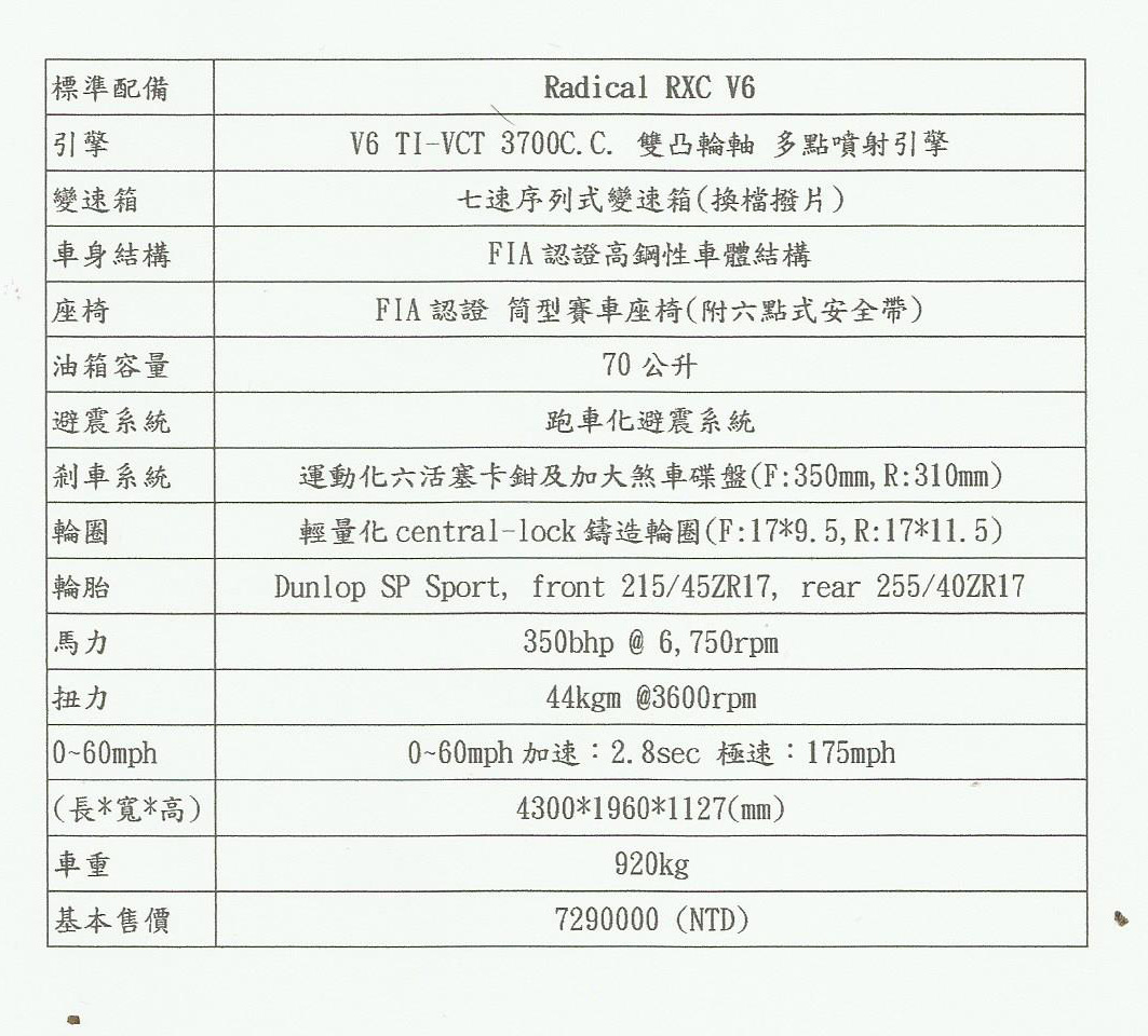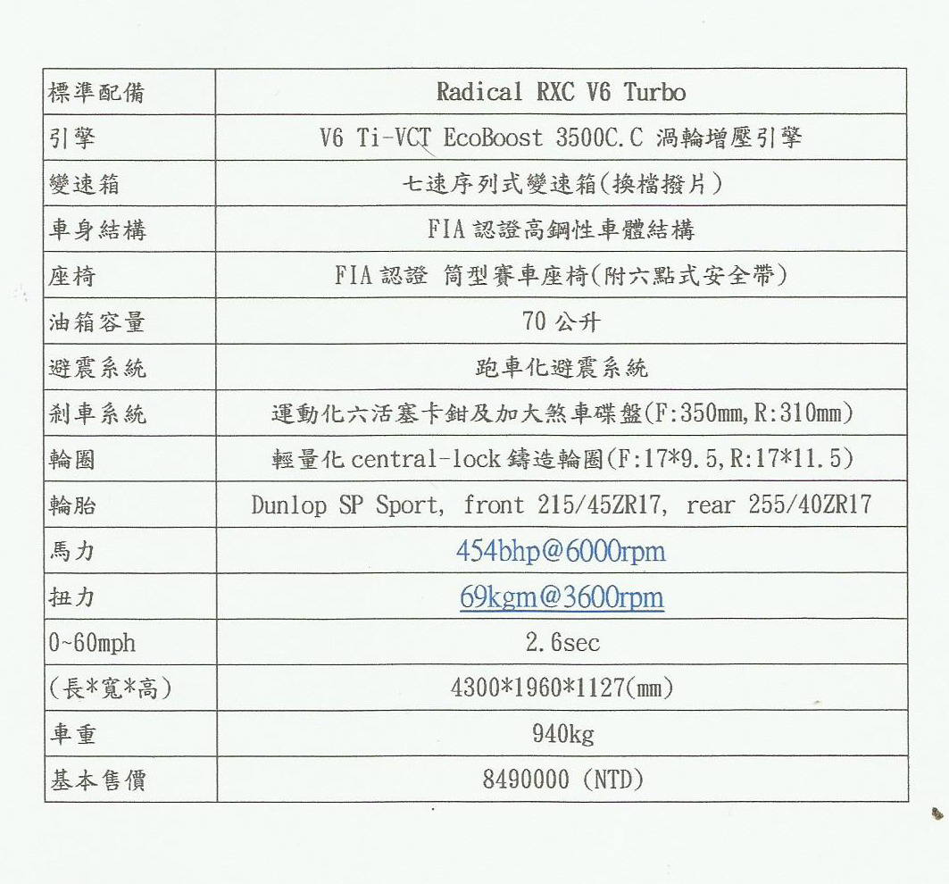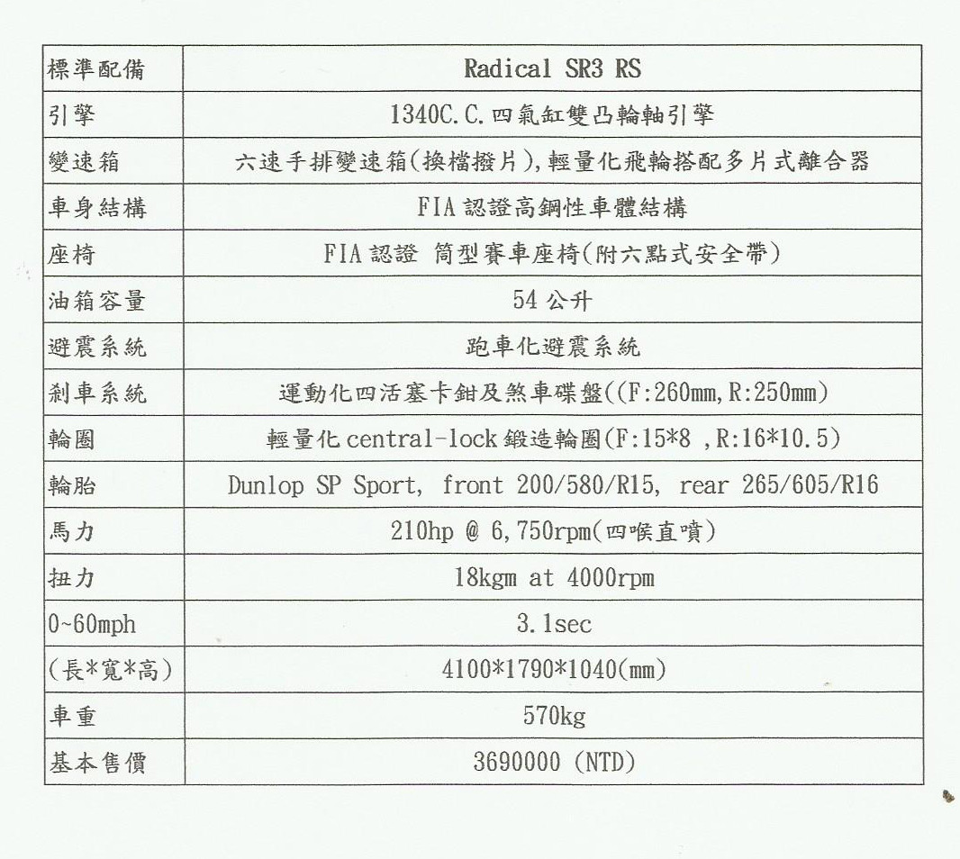 博緒汽車未來也將以接單的方式接受客戶的客製化訂單,並提供客戶最完善的後勤補給與零件資源,期盼在台灣賽車日漸蓬勃的發展下,能夠讓台灣的賽車文化朝向ClubSport Race 的目標邁進。博緒汽車(Rstrada Autosport)配置完善的硬體設施及維修設備不但為客戶提供最完善與隱密的賞車環境外,也顯示出對於對台灣市場的高度重視。Radical售後服務中心備有原廠授權全套專業且完備的維修設施,Radical原廠培訓的認證技師也將在此為客戶提供最完備的車輛設定與維修服務。最後,附上Radical官方影片與總代理博緒汽車(Rstrada Autosport)所提供的規格表。