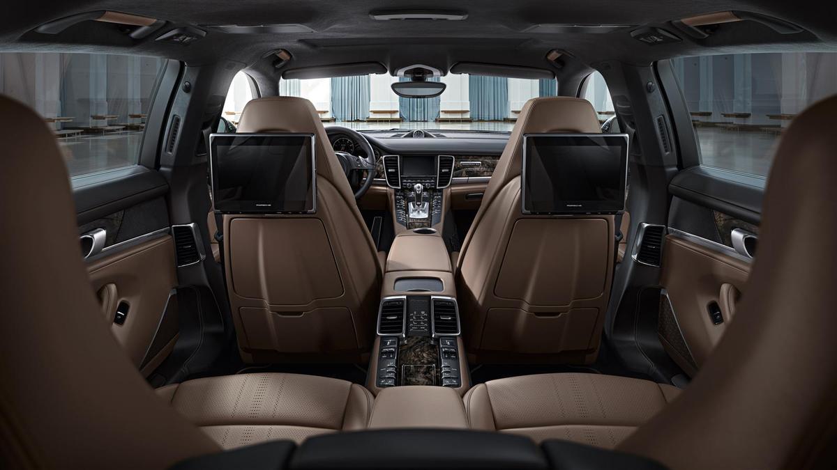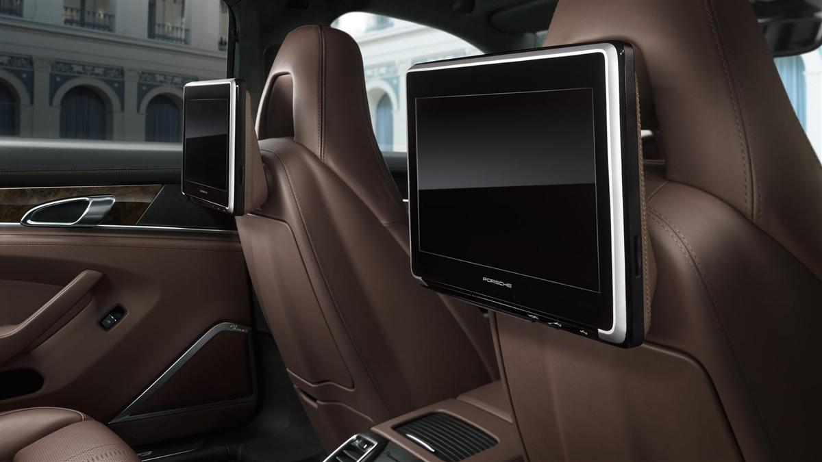 內裝部分,這部Porsche Exclusive Panamera Turbo S Executive使用知名品牌Poltrona Frau的頂級皮革搭配Nappa真皮包覆,同時配有Burmester音響系統與原廠後座影音系統,包含兩座10.1吋螢幕、DVD播放器與耳機等部品。