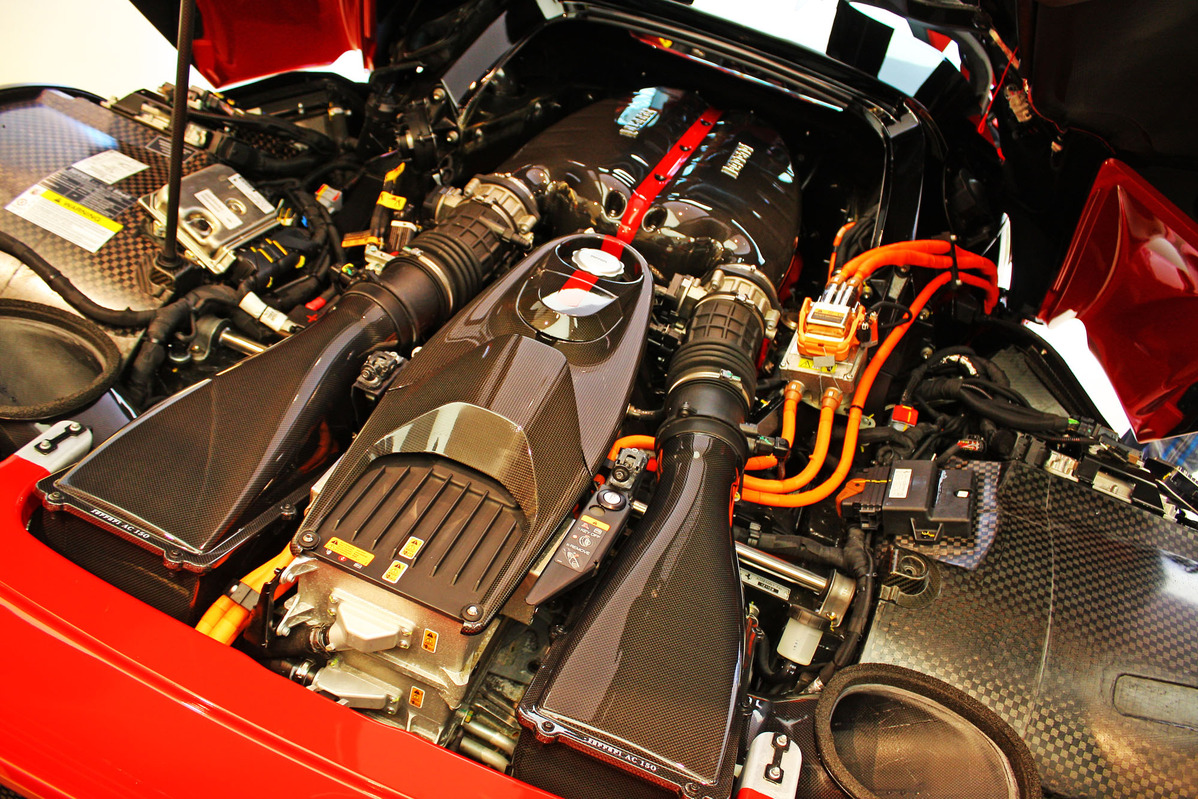 動力部分,繼承Ferrari Enzo之地位、身為現役Ferrari所有車種當中的霸主,Ferrari LaFerrari搭載6.3升V12汽油引擎與電動馬達,汽油引擎部分能於9,000rpm時提供800HP馬力與71.4kgm扭力,電力部分則是能貢獻163HP馬力與27.5kgm扭力,使得它的綜效最大馬力達到963HP,百里加速僅需不到3秒、由靜止加速至時速300km/hr不須15秒、極速超過350km/hr,相當強悍。