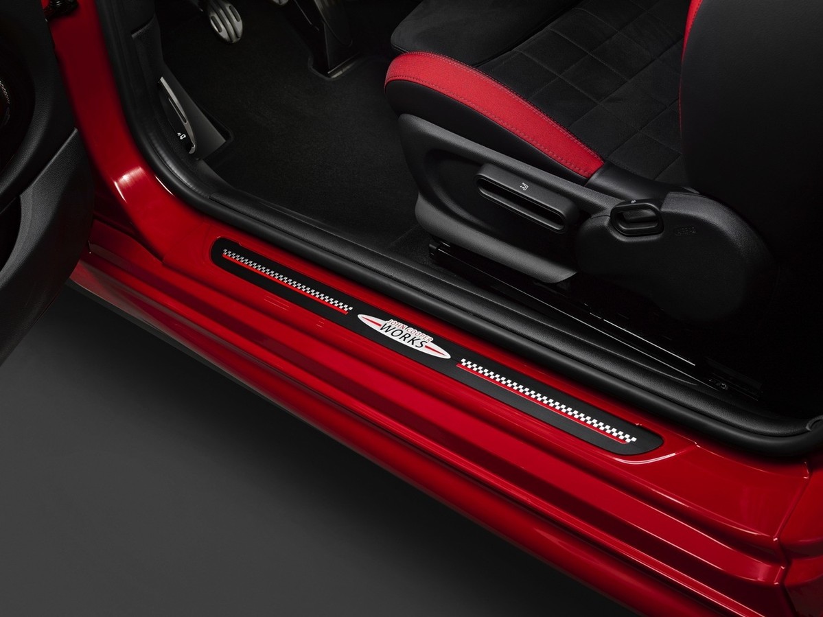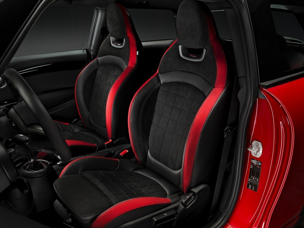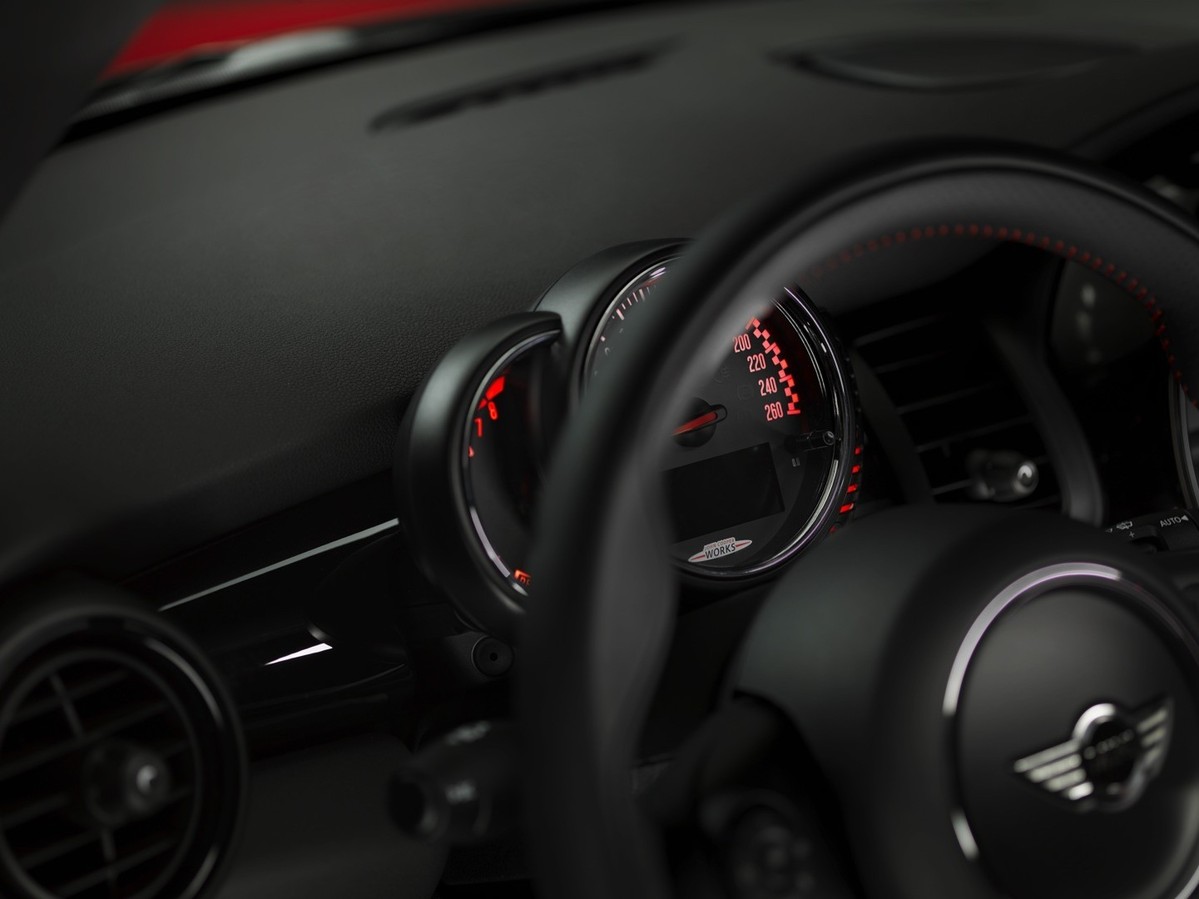 內裝方面,打開車門首先映入眼簾的是JCW門檻與車有紅色縫線的運動版方向盤,搭配麂皮與真皮交錯的JCW可調式賽車座椅、鋁合金腳踏板與黑底儀表板等,營造出相當熱血的高質感氛圍。