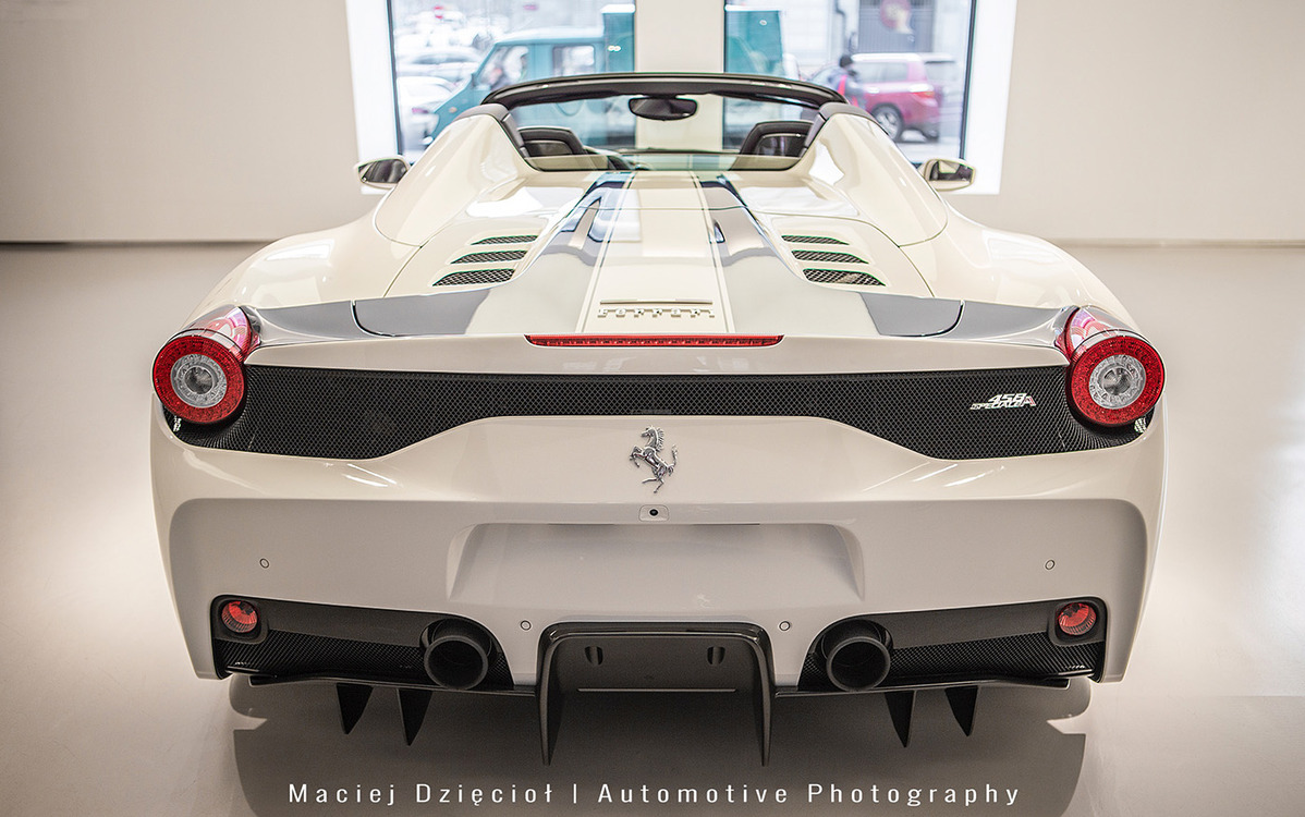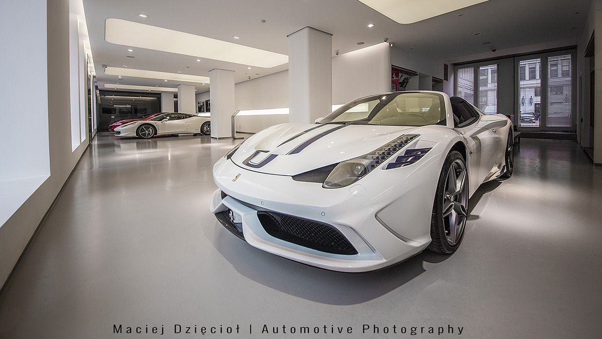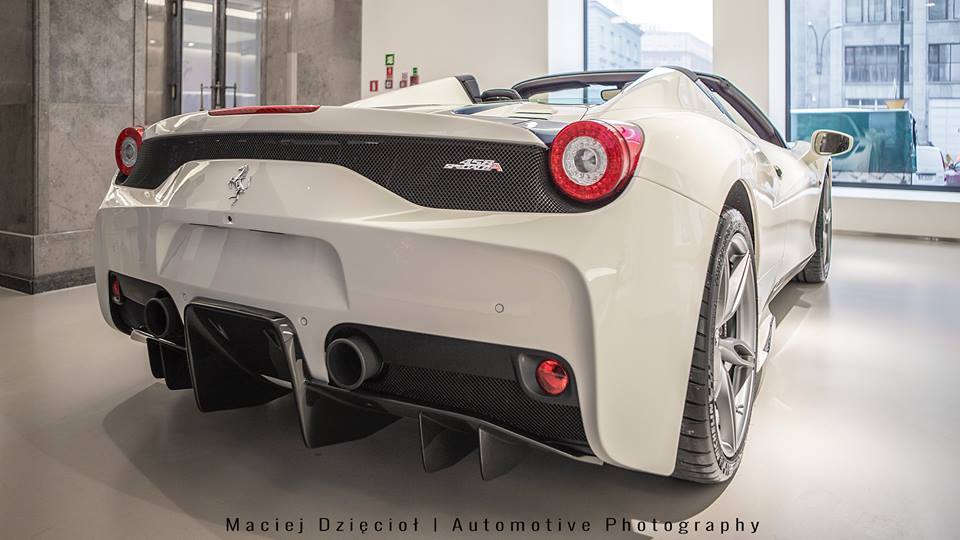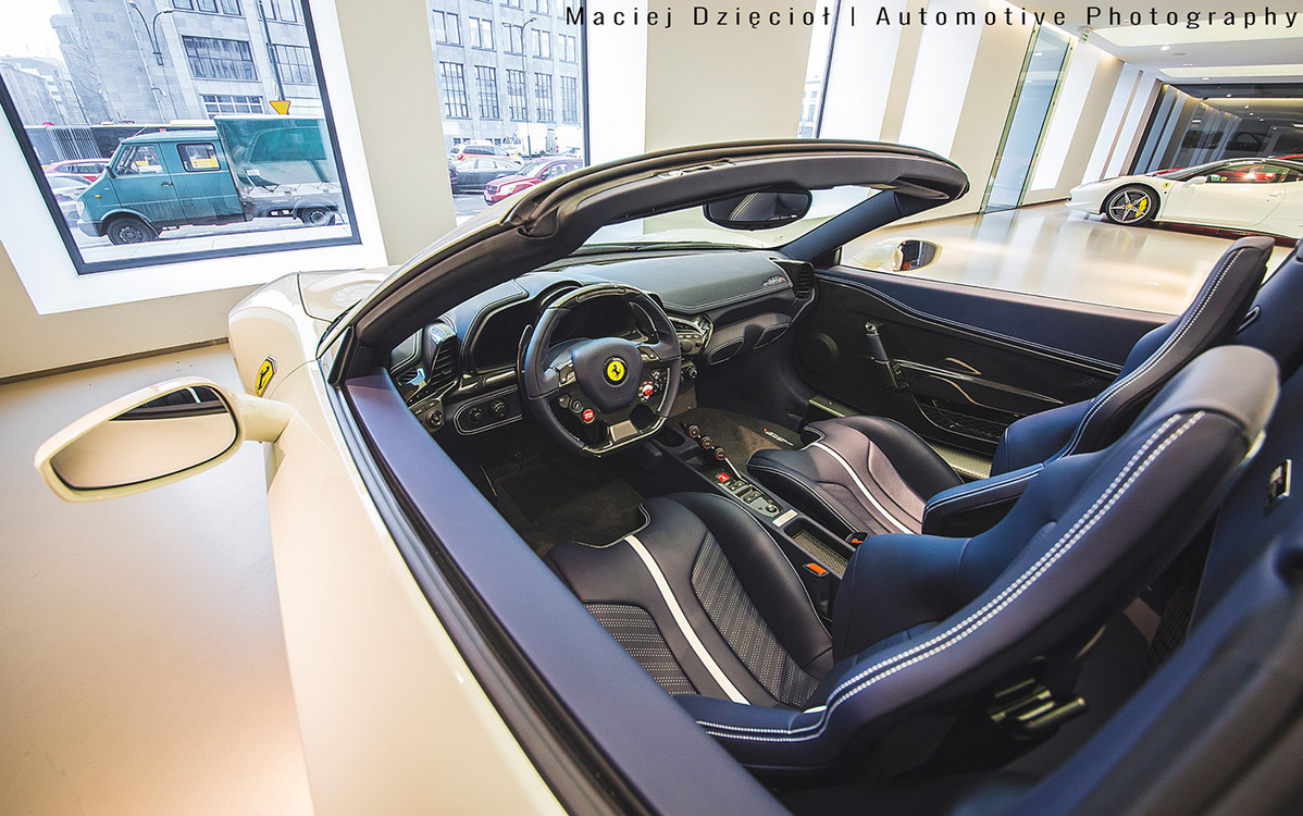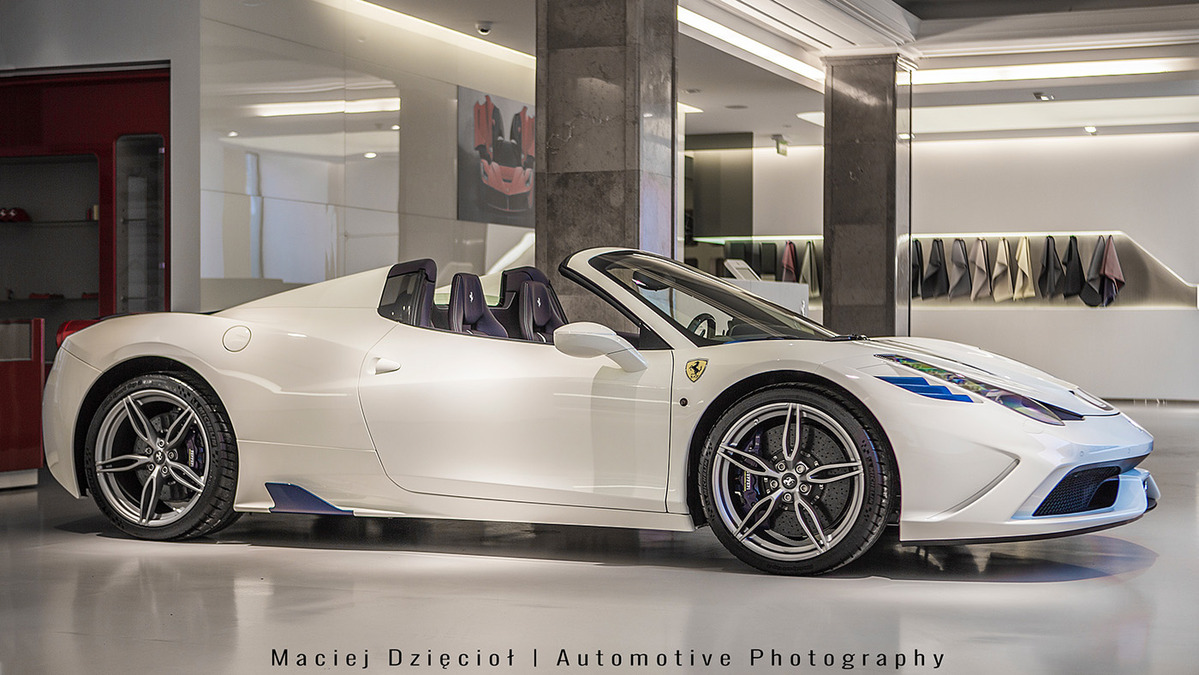 再者,這區區499位的幸運車主們無不希望自己儘速拿到愛車,而就在此刻,中歐國家波蘭(Poland)率先拿到他們的首部Ferrari 458 Speciale!停放在首都華沙(Warsaw)代理商展示間內的她,採用白色車身搭配藍色NART飾條,另外在車身上選用藍色碳纖維部品、藍色剎車卡鉗與槍灰色輪圈,內裝則以藍色真皮與麂皮包覆,搭配白色車縫線與碳纖維飾板,展現出與發表會上現身、採用Giallo Tristrato黃色三層漆者不同路線的高質感。