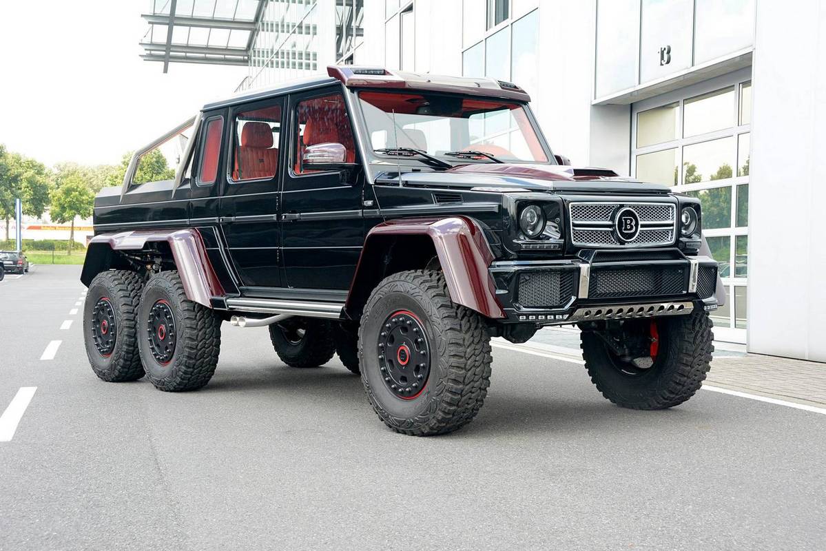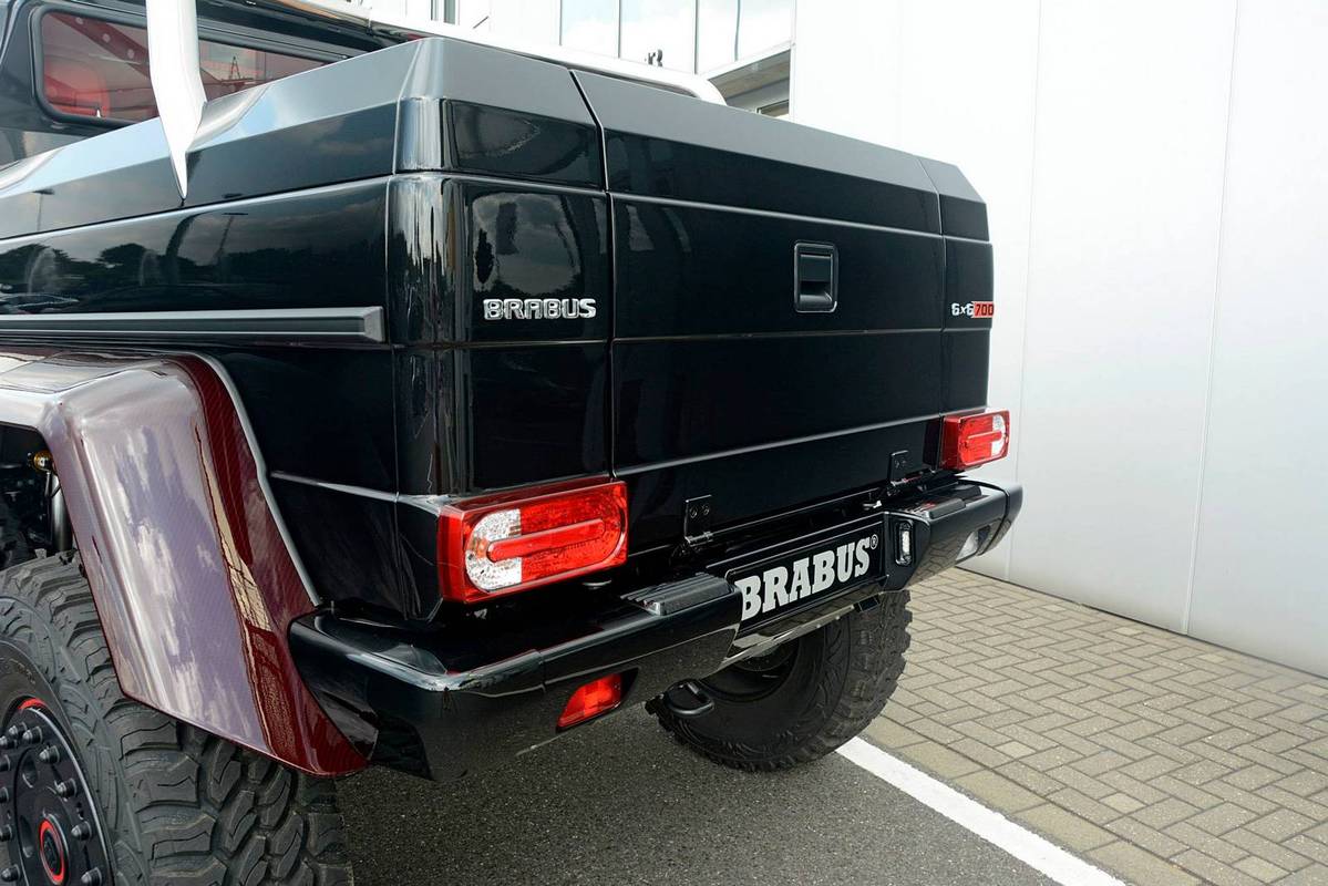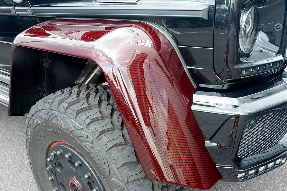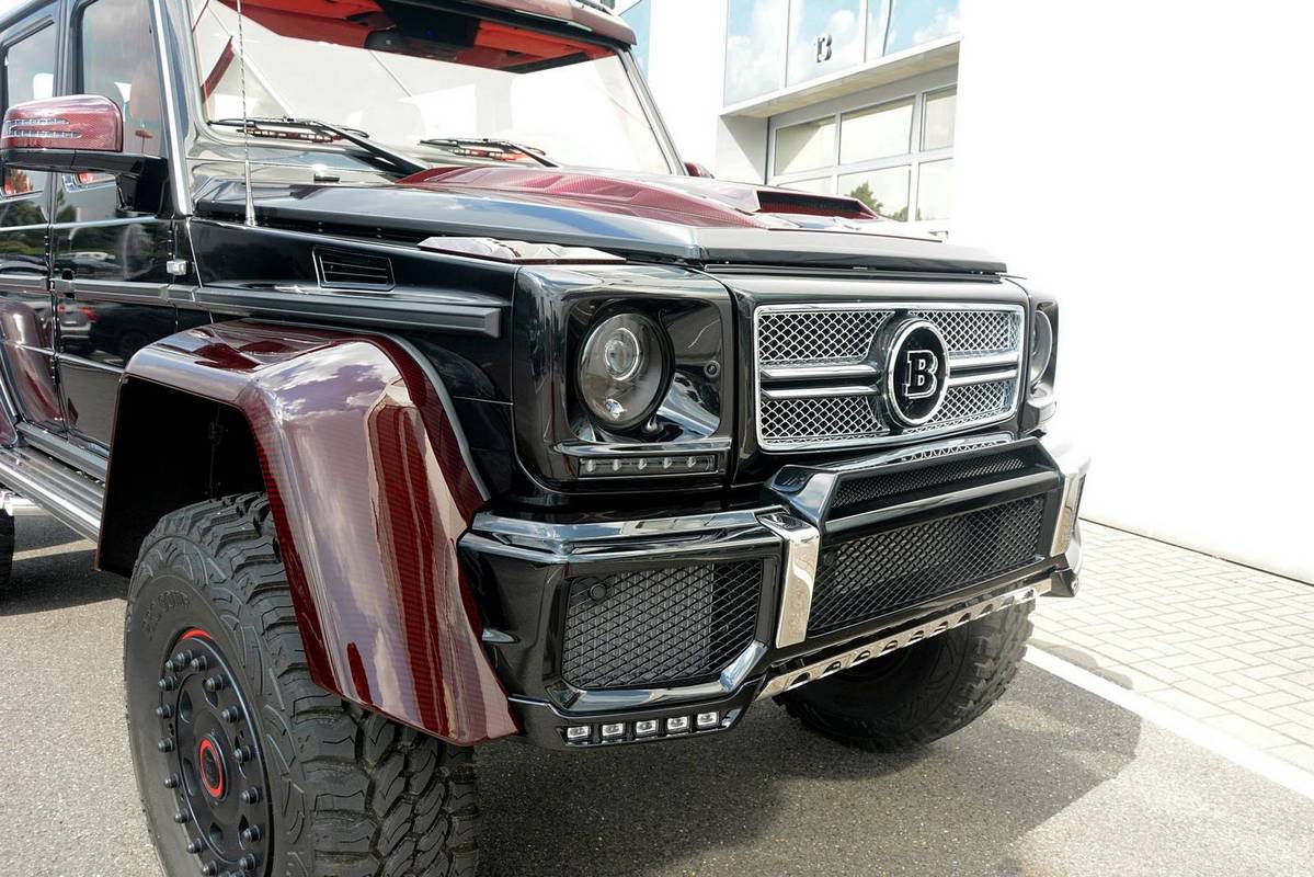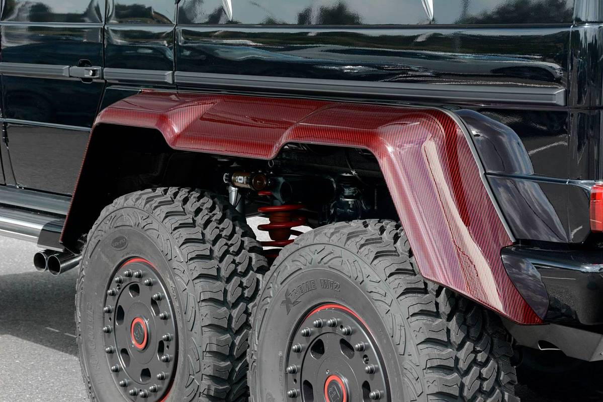 不過,眼前這部Mercedes Benz G63 AMG 6x6乃是專精於Mercedes Benz車系的改裝名廠Brabus的全車改裝版本,取名「Brabus B63S 700 6×6」,在發表之初原本僅預計提供全球2部的配額,沒想到獲得大量熱情訂單,後來又多提供至少5部配額,而畫面中這部Brabus B63S 700 6x6還在四角落輪弧、引擎蓋、進氣口飾板與後視鏡蓋等處用上紅色碳纖維材質,配在其金屬黑色塗裝之車身與紅黑雙色手工真皮包覆之內裝,視覺效果相當與眾不同。
