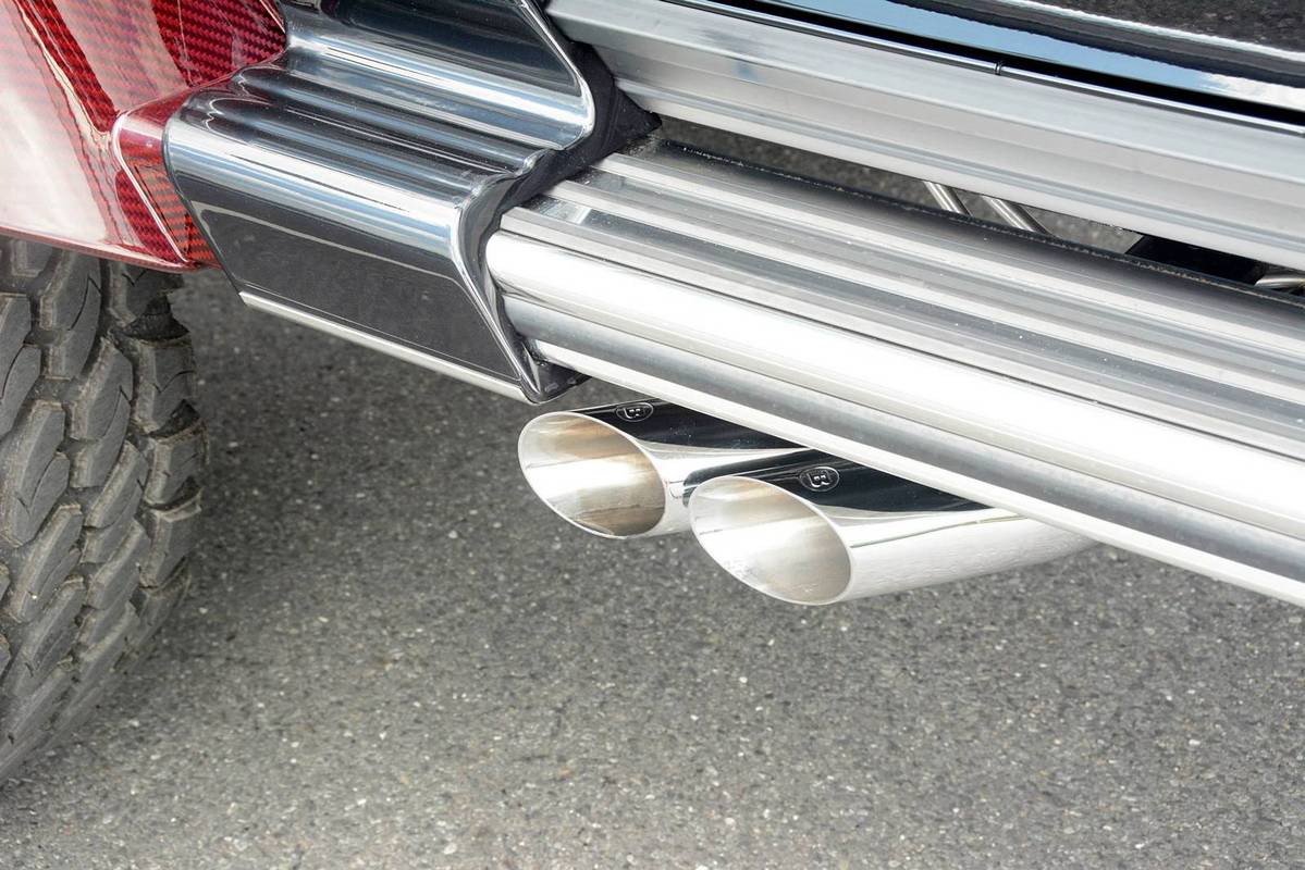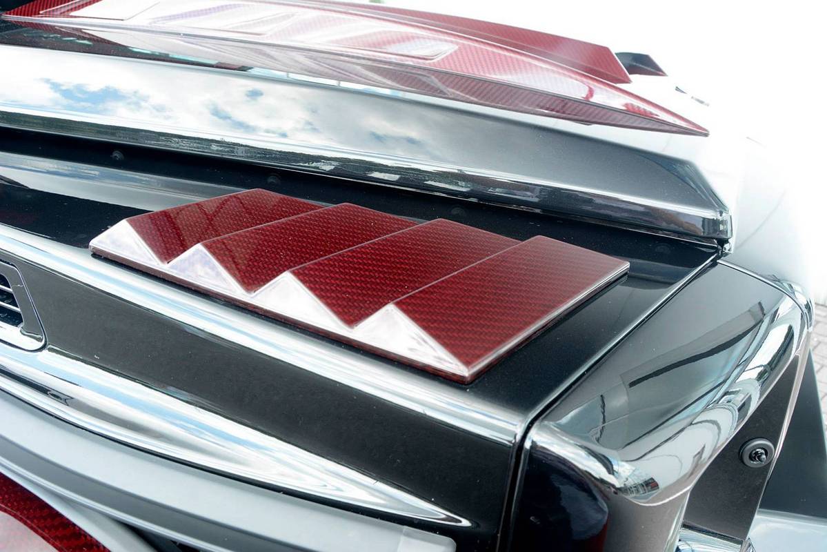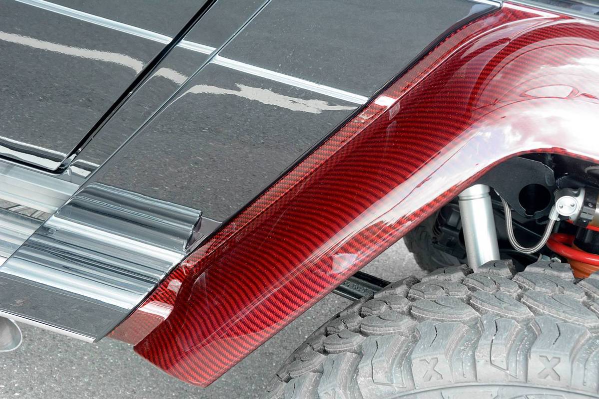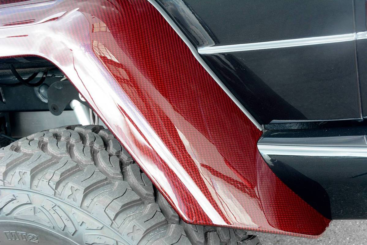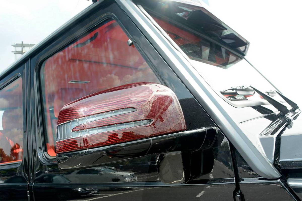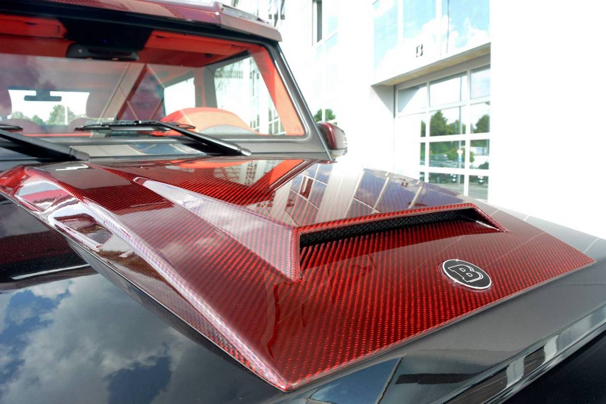 不過,眼前這部Mercedes Benz G63 AMG 6x6乃是專精於Mercedes Benz車系的改裝名廠Brabus的全車改裝版本,取名「Brabus B63S 700 6×6」,在發表之初原本僅預計提供全球2部的配額,沒想到獲得大量熱情訂單,後來又多提供至少5部配額,而畫面中這部Brabus B63S 700 6x6還在四角落輪弧、引擎蓋、進氣口飾板與後視鏡蓋等處用上紅色碳纖維材質,配在其金屬黑色塗裝之車身與紅黑雙色手工真皮包覆之內裝,視覺效果相當與眾不同。
