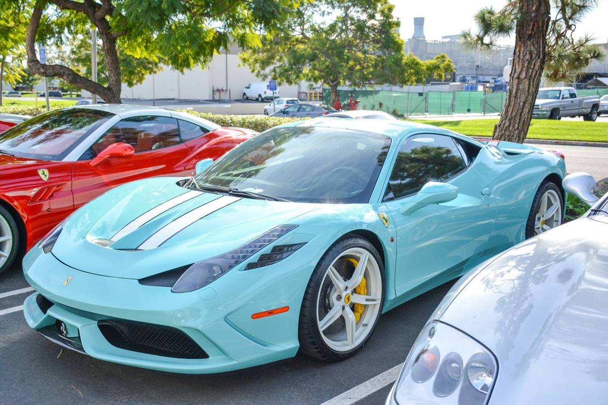 今天與各位分享的是一部上禮拜出席美國加州代理商Ferrari of Newport Beach車聚活動的特殊配色Ferrari 458 Speciale,車身以「Tiffany藍色」塗裝為主軸,搭配白色黑邊的NART雙飾條,連同白色烤漆輪圈與呼應葉子板盾牌的黃色煞車卡鉗,整體吸睛度堪稱破錶!