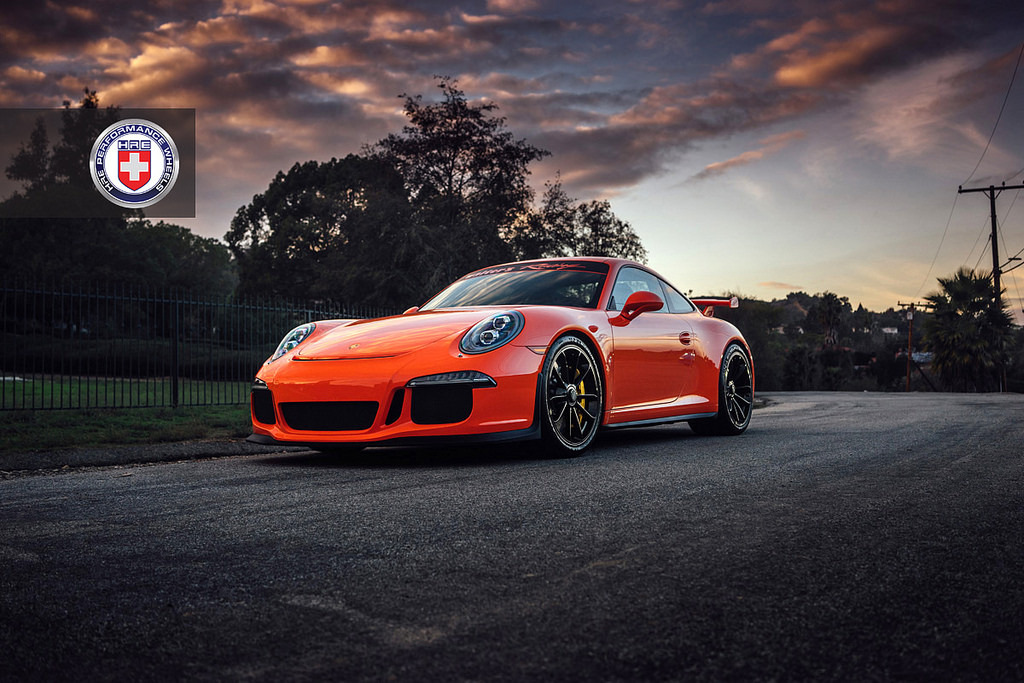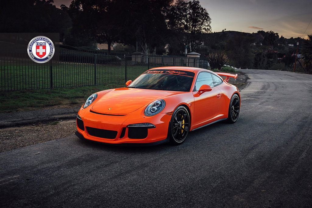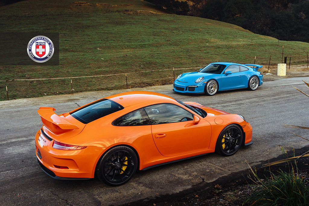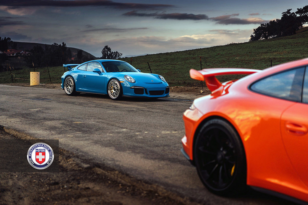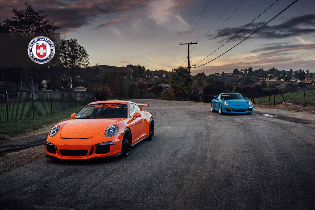 與足蹬名門輪圈的藍色Porsche 991 GT3同台的則是一部橘紅色塗裝、搭配黑色原廠輪圈的同款車型,你會選哪一種風格?