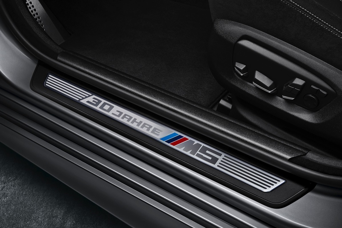 這款紀念版本BMW M5擁有黑色水箱護罩、Frozen Dark Silver Metallic消光暗銀色金屬塗裝、Competition Package套件當中的輪圈與原廠陶瓷碳纖煞車系統,同時於葉子板、門檻、內裝飾板與座椅等處貼上30 Jahre M5 1/300的銘板,以彰顯其不凡身分。