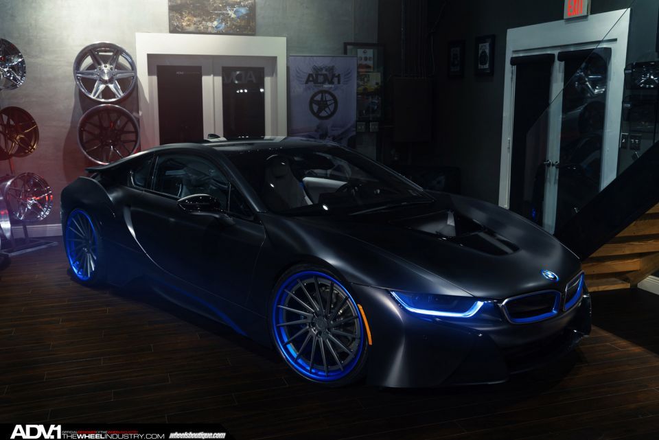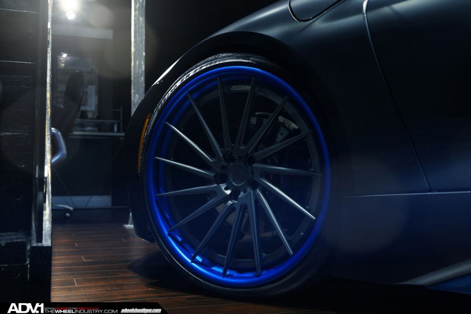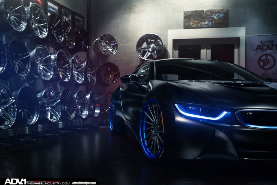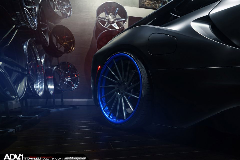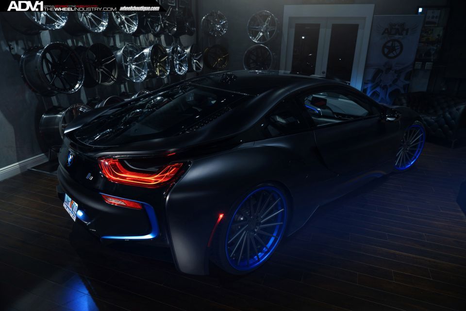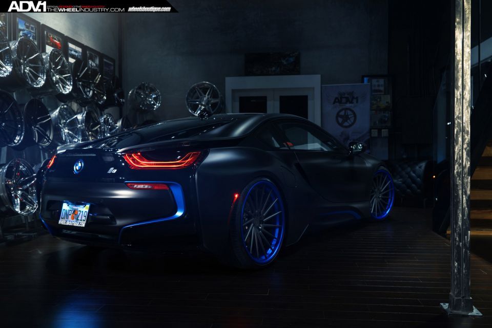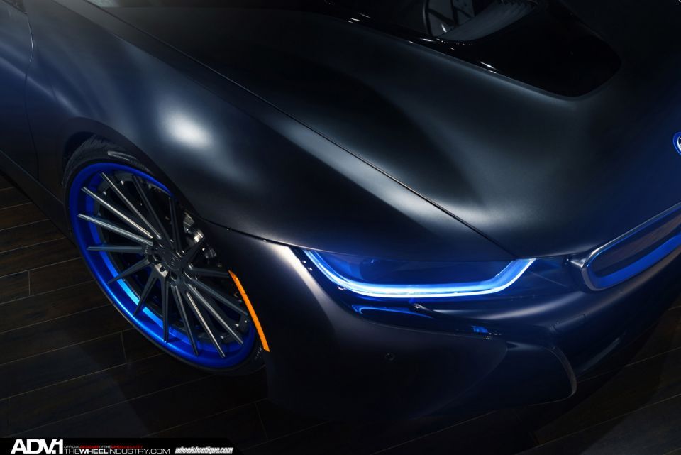 這是由改裝廠Wheels Boutique所操刀的消光黑色塗裝BMW i8,選用ADV.1 Wheels、型號ADV15 TS SL的放射狀Directional系列輪圈,尺寸為前22x9J、後22x10J的前後配規格,搭配前245/30R22、後285/25R22的Pirelli P Zero Nero高性能跑胎,中心以消光槍灰色覆蓋,外圈則是以消光藍色處理,呼應原廠漫步車身的藍色元素,整體搭配得宜。