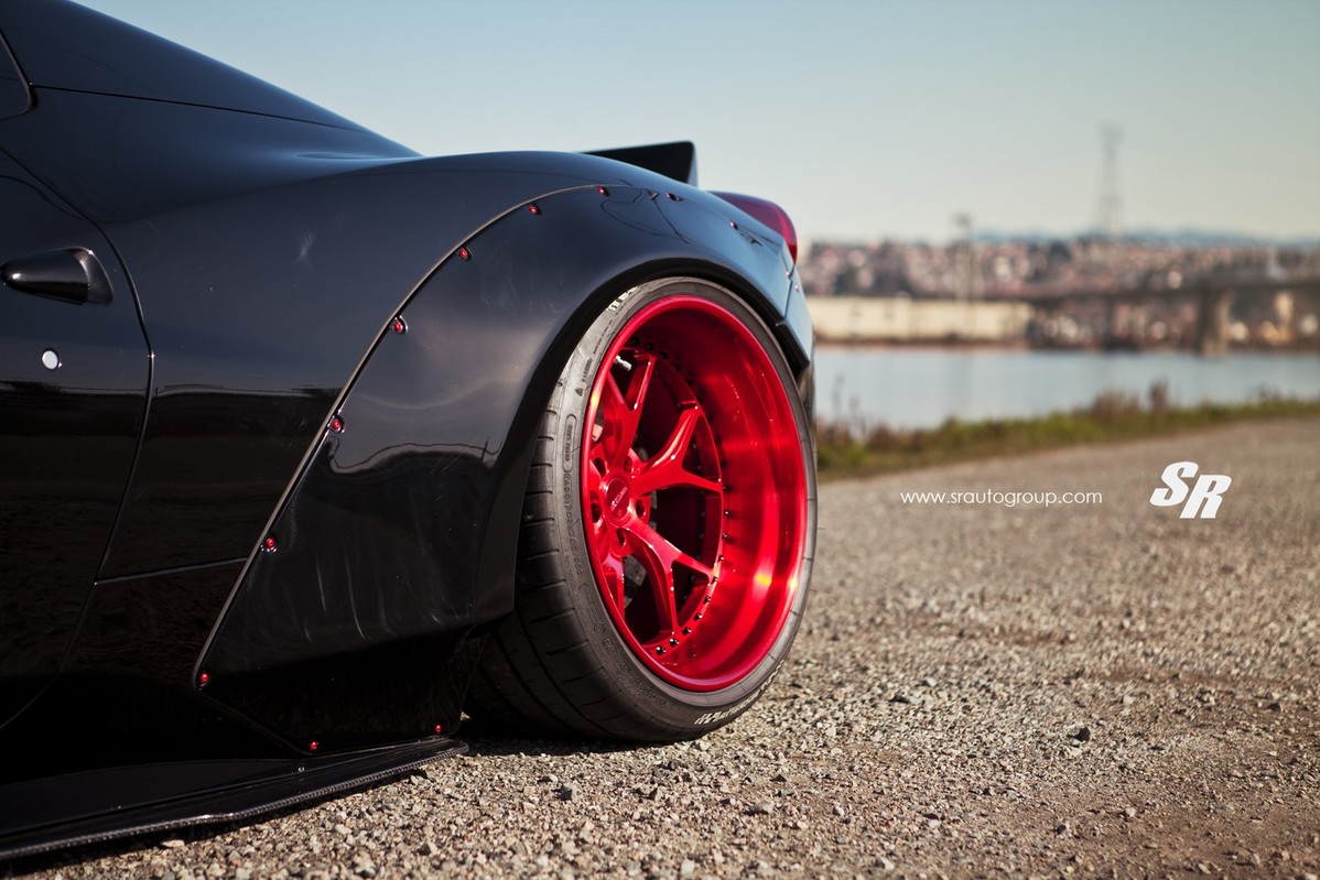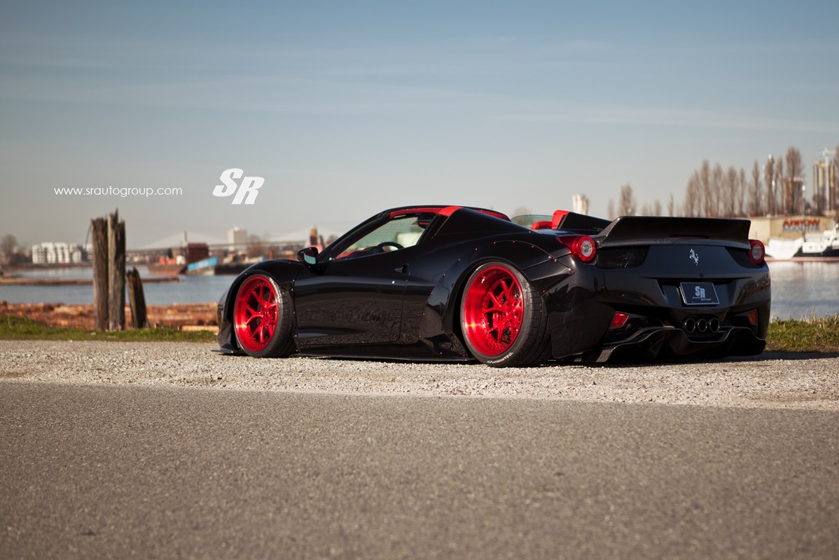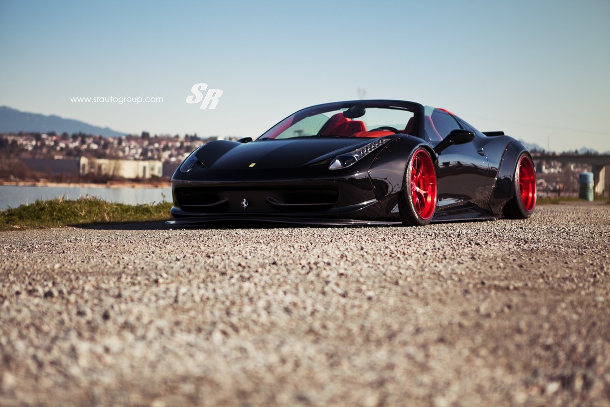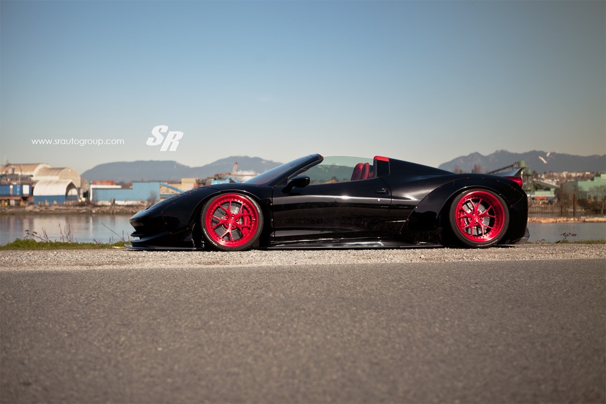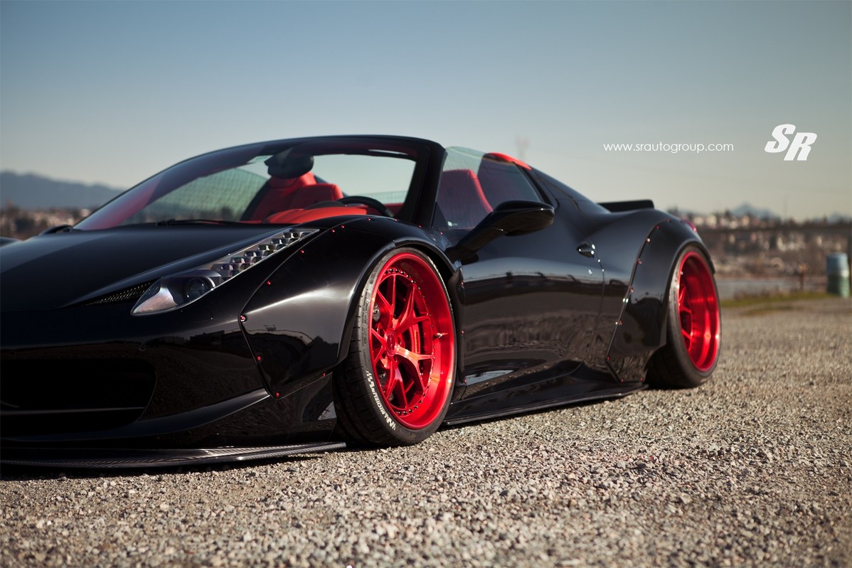今天帶給各位一部由加拿大改裝廠SR Auto Group所操刀的Ferrari 458 Spider,車身採用Nero Pastello黑色塗裝搭配紅色全真皮內裝,另外換裝Liberty Walk Performance寬車體空力套件,搭配電鍍紅色PUR內凹款式輕量化輪圈,再透過高低可調式避震器的換裝將車身將得極低,寬車體輪弧部分特別選用紅色鉚丁,呼應整車紅與黑的迷人節奏。