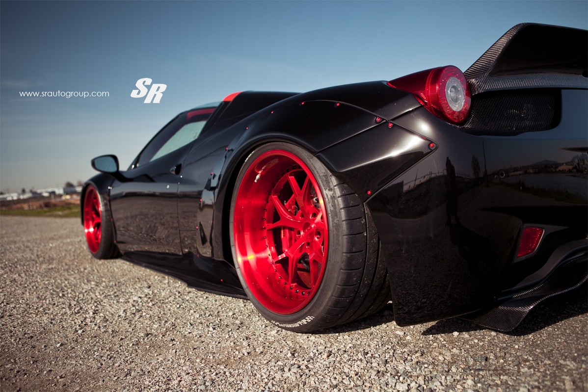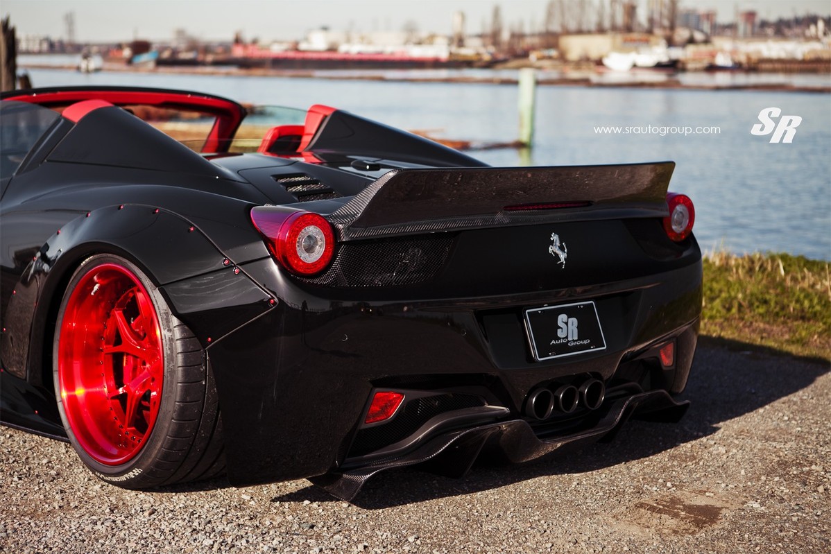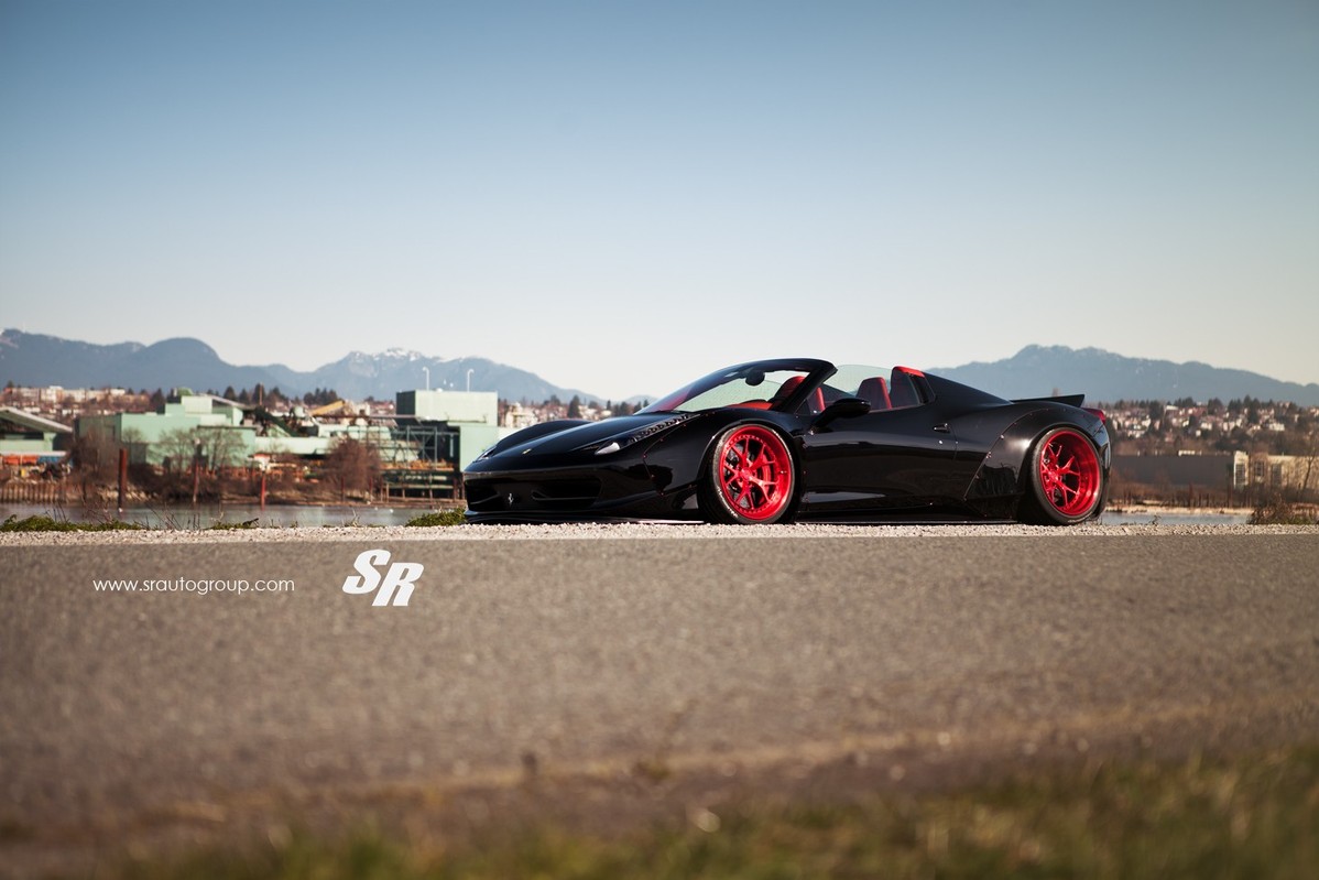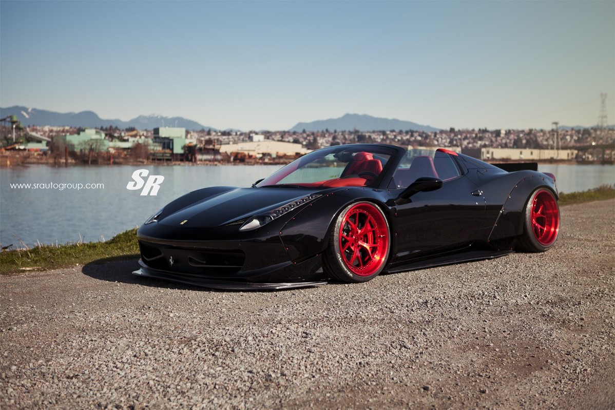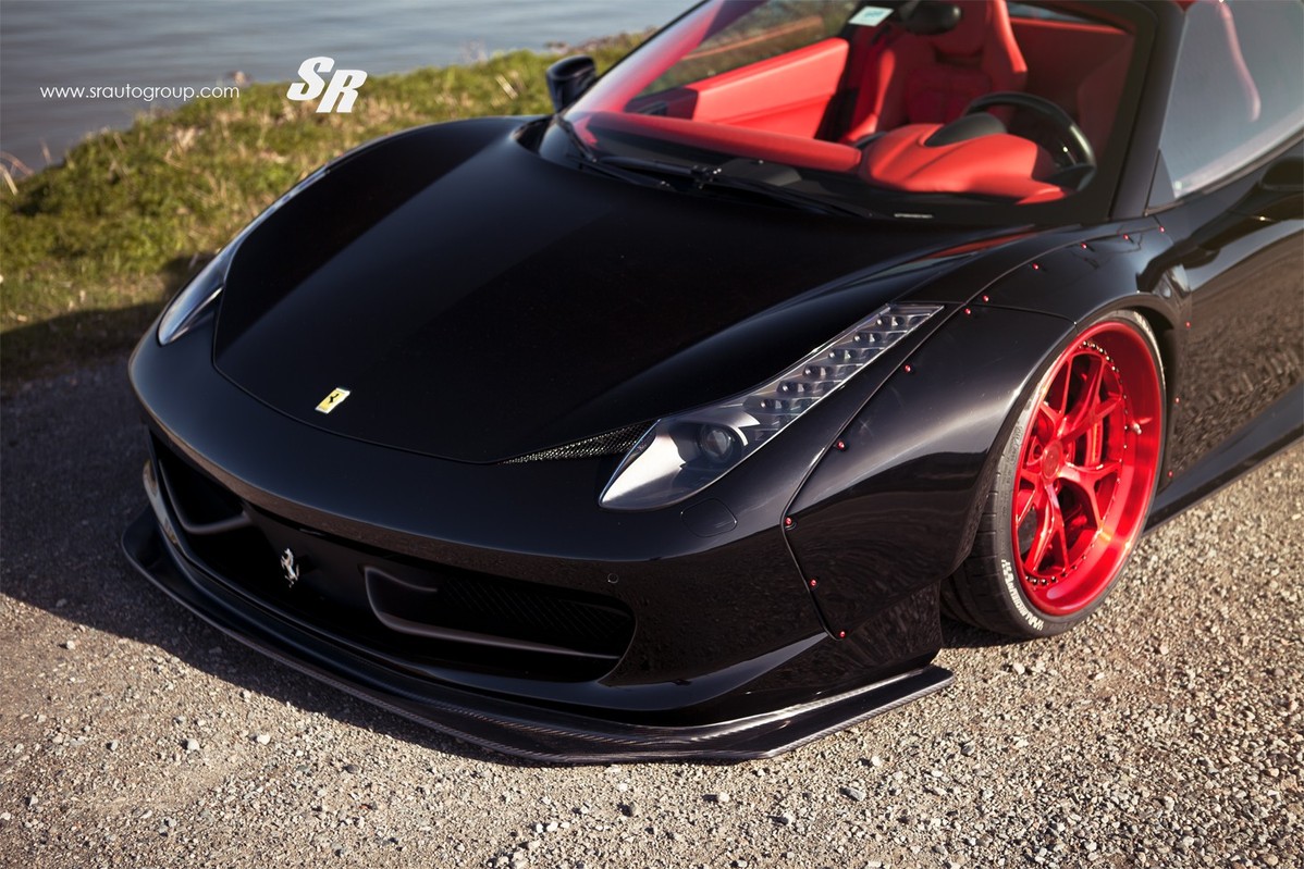 今天帶給各位一部由加拿大改裝廠SR Auto Group所操刀的Ferrari 458 Spider,車身採用Nero Pastello黑色塗裝搭配紅色全真皮內裝,另外換裝Liberty Walk Performance寬車體空力套件,搭配電鍍紅色PUR內凹款式輕量化輪圈,再透過高低可調式避震器的換裝將車身將得極低,寬車體輪弧部分特別選用紅色鉚丁,呼應整車紅與黑的迷人節奏。