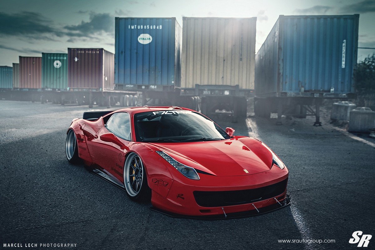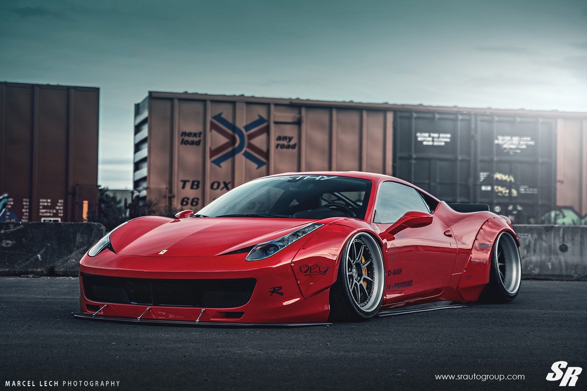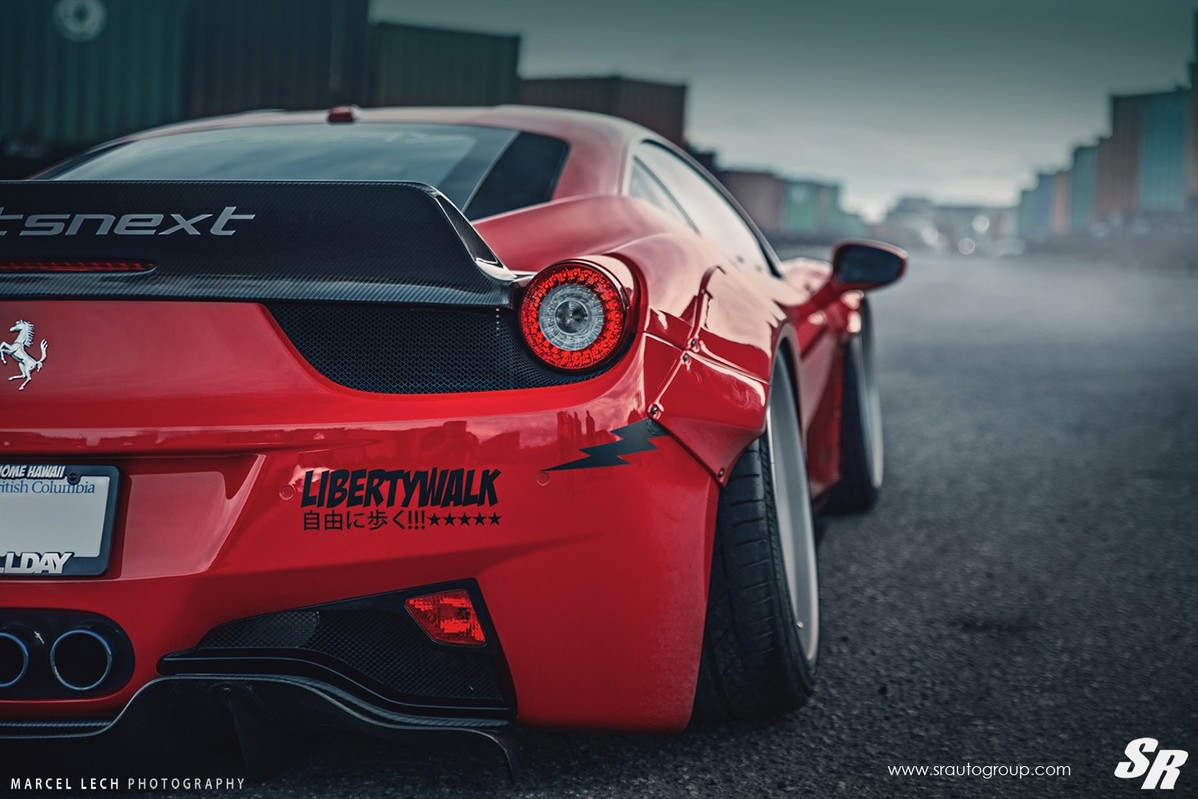 這是一部穿戴著日本Liberty Walk Performance寬車體套件的紅色Ferrari 458 Italia,搭配碳纖維前下巴、後上擾流尾翼與來自PUR Wheels、型號LG08的20吋多片式輪圈,再輔以氣壓式高低可調避震器組,使其有著獨特之趴低飛行氣勢。