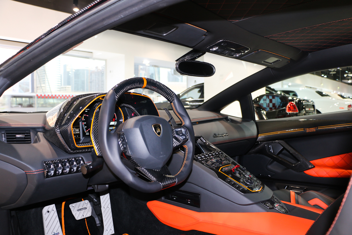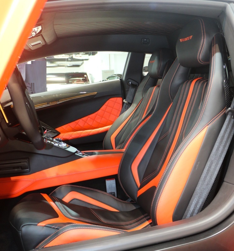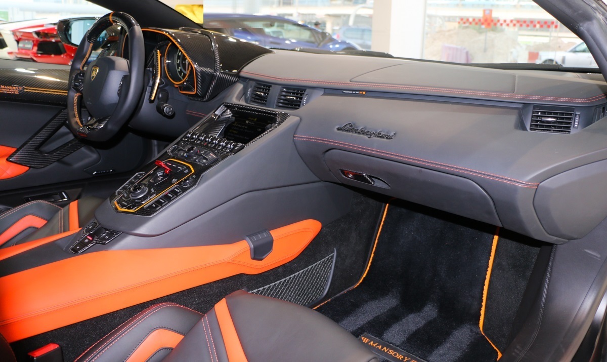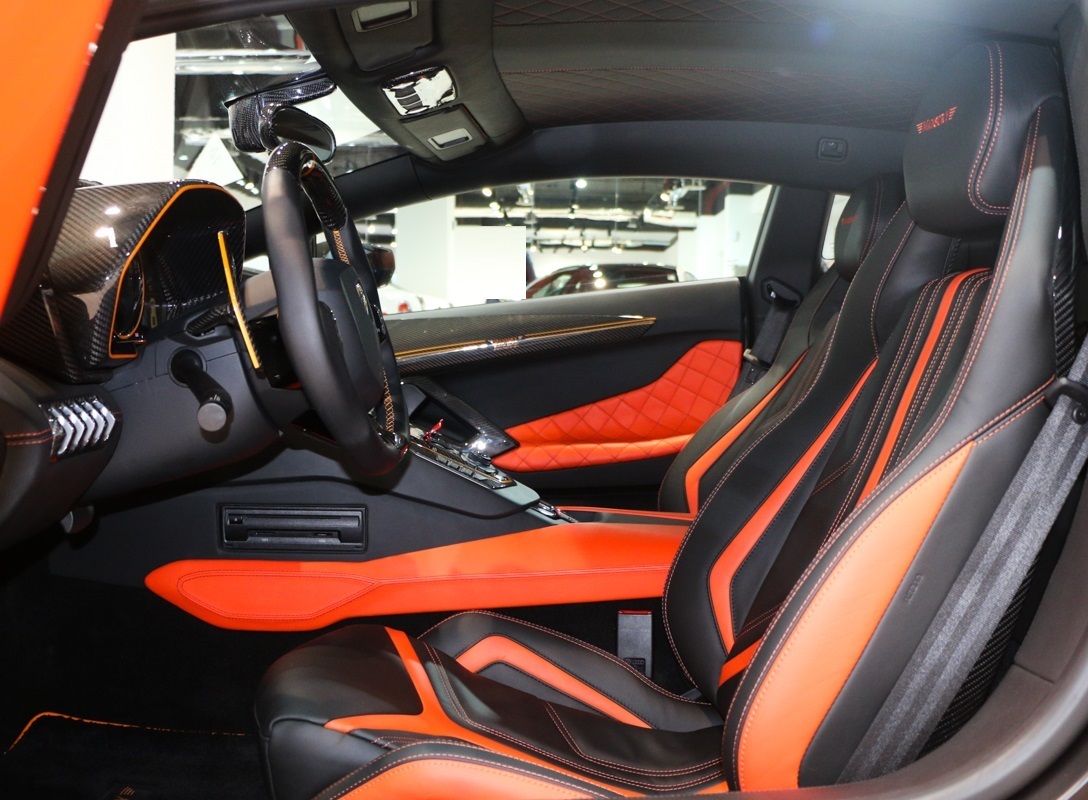 除此之外,這部2015年款式的Lamborghini Aventador LP700-4在內裝部分藏著Mansory的鬼斧神工,用上大量碳纖維材質打造各部位飾板,再加上Mansory鋁合金腳踏板、刺繡腳踏墊組,搭配與車身相同的橘色車縫線與頂級皮革,質感上乘。