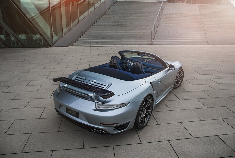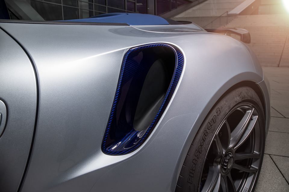 這部身披銀色塗裝的Porsche 991 Turbo S Cabriolet配有TechArt專屬前下巴、側裙組、碳纖維前保桿氣壩飾板、碳纖維後視鏡蓋、碳纖維後下擾流板、碳纖維側面進氣孔蓋板與碳纖維後上擾流尾翼等部品,其中碳纖維材質部分皆以藍色紋路示人,搭配手工縫製的部分藍色內裝,整體質感提升不少。