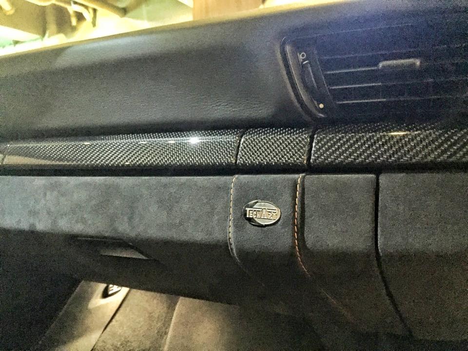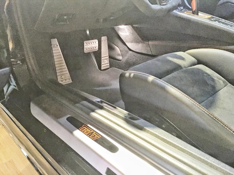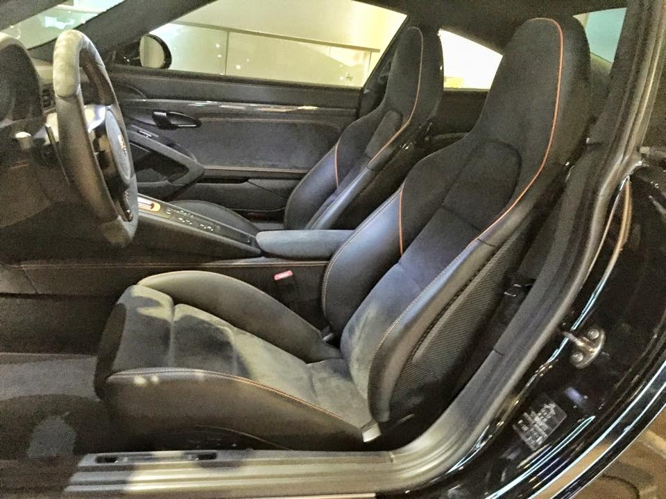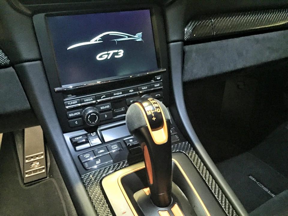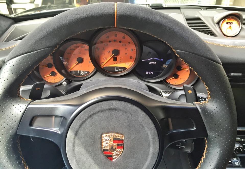 內裝部分可說是該部TechArt 991 GT3的重頭戲,除了原廠選配的18向調整全功能跑車升級座椅、電熱座椅、附上衛星導航功能的PCM保時捷通訊管理系統之外,全車更由德國TechArt原廠特別訂製,換上TechArt平底賽車方向盤、鋁合金腳踏板、休息踏板與門檻,也將儀表板連同跑車計時碼錶底座換成橘色式樣,另外用上高檔灰黑色麂皮材質包覆,再以橘色飾板與車縫線襯托出對比,加上環伺車艙的碳纖維飾板與鑲嵌在副駕駛側的TechArt銘板,質感與跑格兼具。
