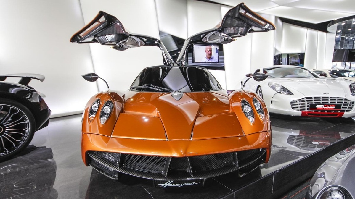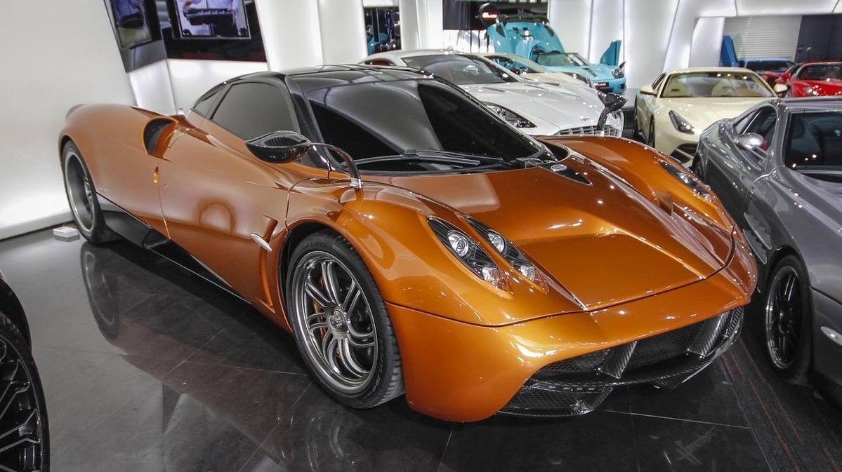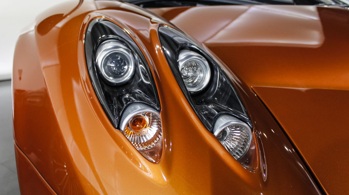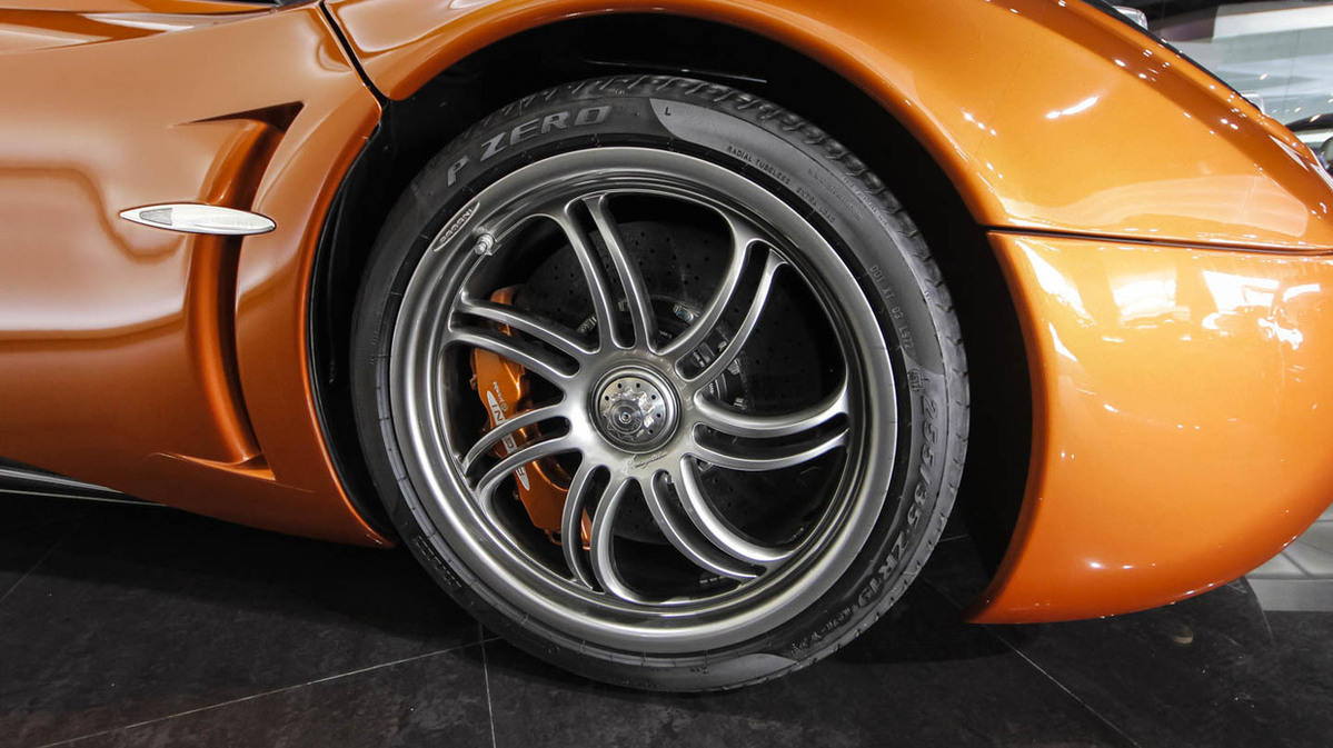 這部身披金屬橘色塗裝的Pagani Huayra為2013年款式,選配有諸多原廠碳纖維套件,分佈於前下巴、側裙組、後保桿、後下擾流板與車尾上緣等處,再搭配拋光輕量化輪圈與橘色煞車卡鉗,別具風味。