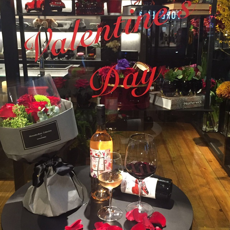 「MercedesBenzPopUpTaipei 品牌概念館」於西洋情人節夜晚享用晚餐,即可以優惠價格加購【星動組合】 ,包含開胃粉紅酒兩杯、紅酒兩杯及 honeyDaniels 聯名花禮,組合價特惠新台幣1500元。