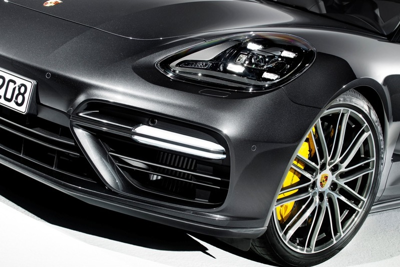 Panamera的車寬僅增加了6公釐,但感覺上就像增加了數公分一樣,這是由於A形進氣口向兩側延伸,視覺上形成一種全新車頭設計的效果。同時,散熱器格柵上特殊設計的橫桿可強調車身的寬度。引擎上方的箭頭形引擎蓋也更進一步強化此視覺效果,使車身看起來更前傾、低張,這是因為拱形引擎蓋上的動感折線現在已一路延伸至保險桿。車輛概念採用的全新緊湊式引擎結構,可塑造出更低張的車頭。引擎蓋左右兩側的線條精準地融入更外擴的前葉子板造型,典型的保時捷設計特徵之一。LED頭燈內建提供3種版本選擇的LED日間行車照明,同樣也散發出自信的魅力。