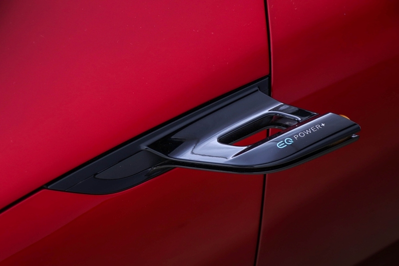 側面動感的車頂線一路向下延伸至流暢車尾,無窗框的設計則凸顯動態跑格,更特別的是傳統後視鏡以微型攝像鏡頭取代,營造更為出色的空氣力學表現,更在鏡頭上標示"EQ Power+"以強調其無可比擬的高效強悍混合動力心臟。