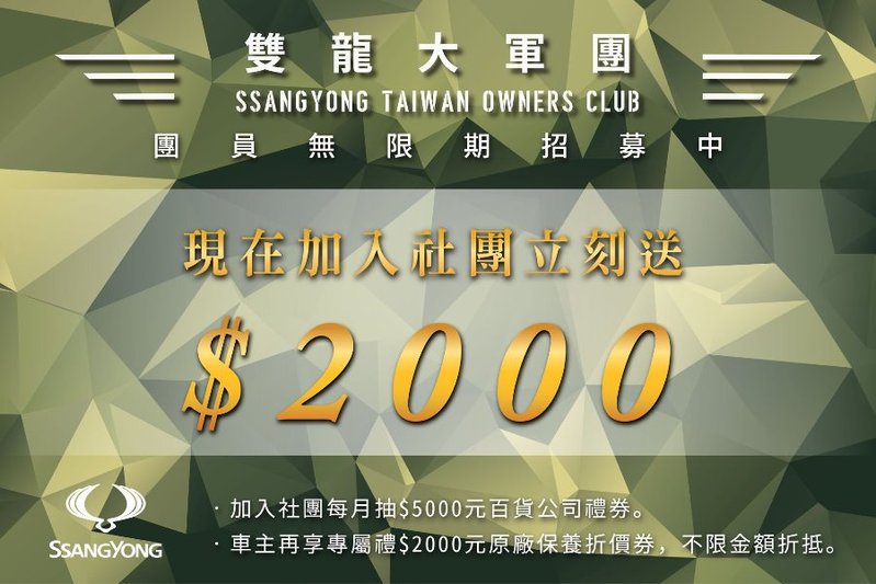 雙龍車主加入即送2000元原廠現金保修折抵券