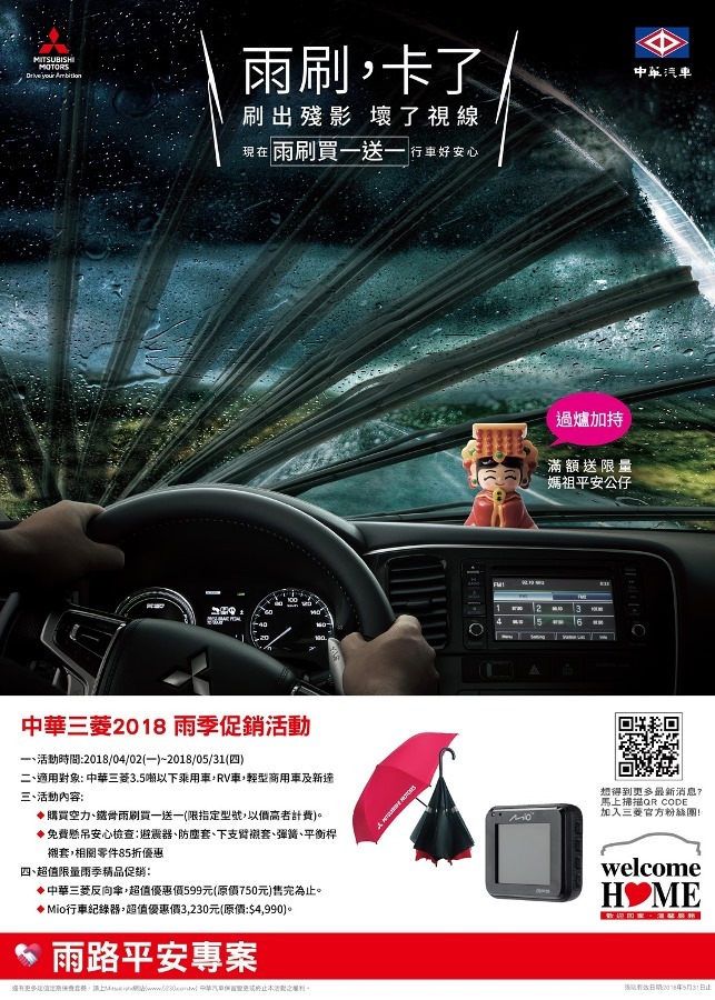 梅雨季節溼答答,不要讓行車視線霧茫茫,中華三菱推出雨路平安專案,即日起至2018年05月31日止,雨刷買一送一(限指定型號,以價高者計費)超值優惠方案,另外搭配懸吊系統健診(相關零件85折優惠),讓車主行車好安全。