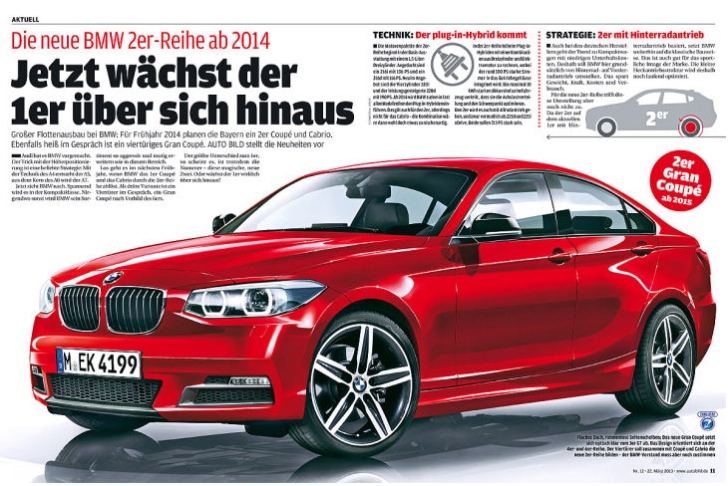 根據知名媒體AutoBild的說法,圖片中的這台BMW 2系列其實就是目前代號F20的1系列衍伸出來的四門車款,而間諜照中的雙門跑車車款與軟頂敞篷車款即將在2014年率先公布。除此之外,據聞BMW 2系列,為了迎戰Mercedes-Benz CLA與新款Audi A3,將會出現轎跑車型(Gran Coupe)。綜合以上的說法,這張圖片應該的確就是BMW 2系列的Gran Coupe車型,如果是,那麼面對Mercedes-Benz CLA45 AMG的會是什麼型號? 是"2M"還是"M2"? 我們目前不得而知,靜待更新消息。