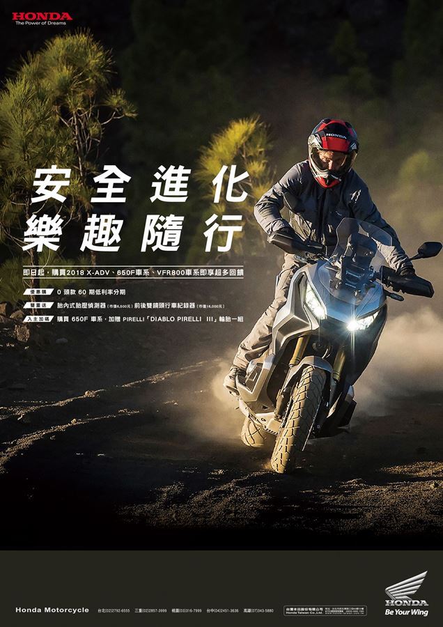 Taiwan便不斷推動安全的駕駛觀念與技巧,讓顧客擁有安全的環境、享受更多的騎乘樂趣。為讓顧客能在騎行上實現「安全 樂趣」體驗,Honda Taiwan於5/1到5/31推行「安全精進 提昇樂趣」購車專案,針對人氣機種2018 X-ADV、NC750S、CB650F、CBR650F、VFR800F與VFR800X推行零頭款60期低利率2.99%分期方案,並為推行安全理念,贈送市價6,500元胎內式胎壓偵測器與16,000的前後雙鏡頭行車記錄器,650F車系另加贈PIRELLI「DIABLO PIRELLI ROSSO