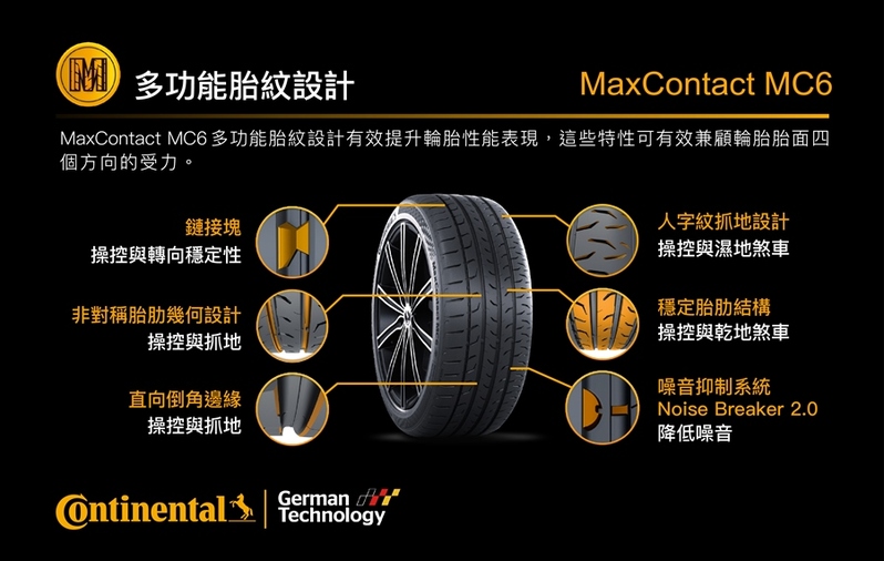 MaxContact MC6人字紋抓地設計、直向倒角邊緣、鏈接塊、穩定胎肋結構、與非對稱幾何設計等多項獨特設計,有效提升了抓地力和轉向性能,同時縮短乾溼地煞車距離,確保駕駛安全,噪音抑制系統也提供了舒適寧靜的行車體驗。
