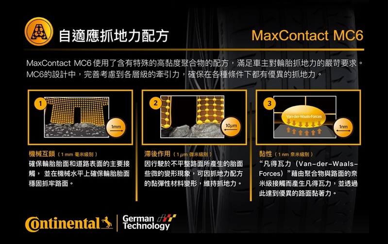 MaxContact MC6 多功能胎紋設計,進一步優化抓地力與運動操控表現,同時縮短乾溼地煞車距離,自適應抓地力配方,帶來出色的路面反饋與奈米等級抓地力;同時,兼顧低噪音與更高行駛里程,滿足車主的期待。