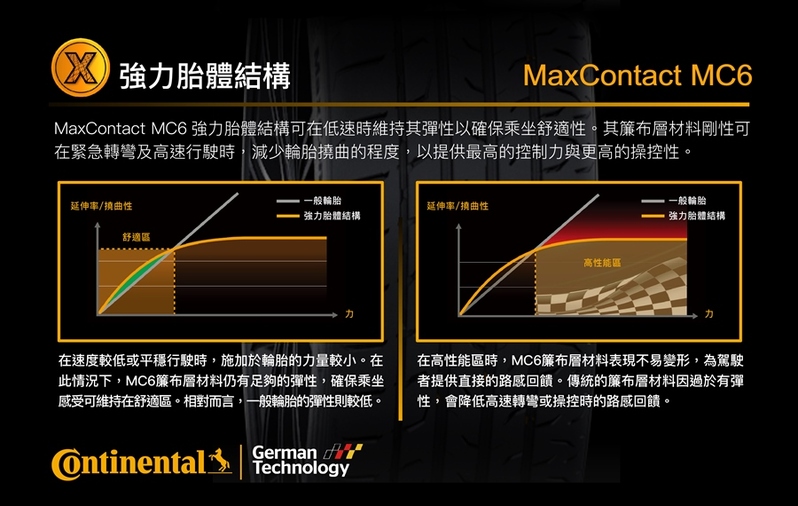 MaxContact MC6使用的簾布層是一種高剛度的材質,大幅提升轉向性能的精準性,在低速行駛時,簾布層材質則保持了較好的彈性,帶來舒適的駕乘體驗,在高速行駛時能够降低輪胎在緊急轉向時的曲撓,提供更佳操控性。