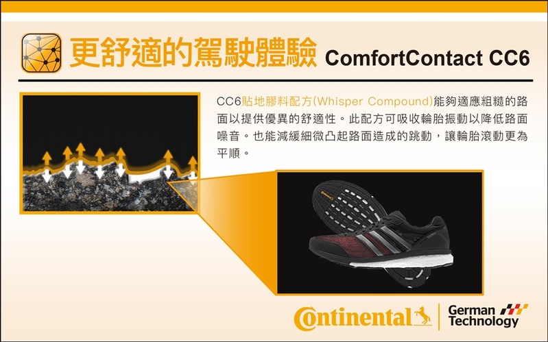 ComfortContact CC6配方中的貼地膠料配方(Whisper Compound),能夠適應粗糙的路面,填充路面凹凸不平的部分,減緩震動,從而降低了輪胎噪音,讓輪胎滾動更為平順。