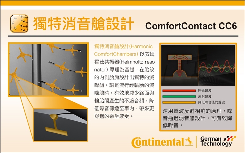 以“亥姆霍兹共振器”的原理為基礎,ComfortContact CC6的胎肩部位配有消音艙,聲波通過進出消音艙,可以消除令人不適的噪音頻率。此外,獨特變頻降噪器設計,可打散流竄於胎面凹槽中的音波以降低噪音量,確保安靜的行駛。