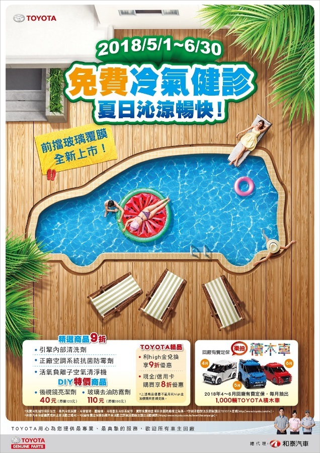 除了上述好康外,即日起至 2018/6/30,車主於涼夏健診活動期間內回廠有費定保,即可參加樂抽積木小車活動,活動期間每月抽出 1,000名車主贈送TOYOTA專屬積木小車。相關活動及優惠詳情,請至涼夏健診活動網頁查詢 (http://event.toyota.com.tw/201805_summercp/)。