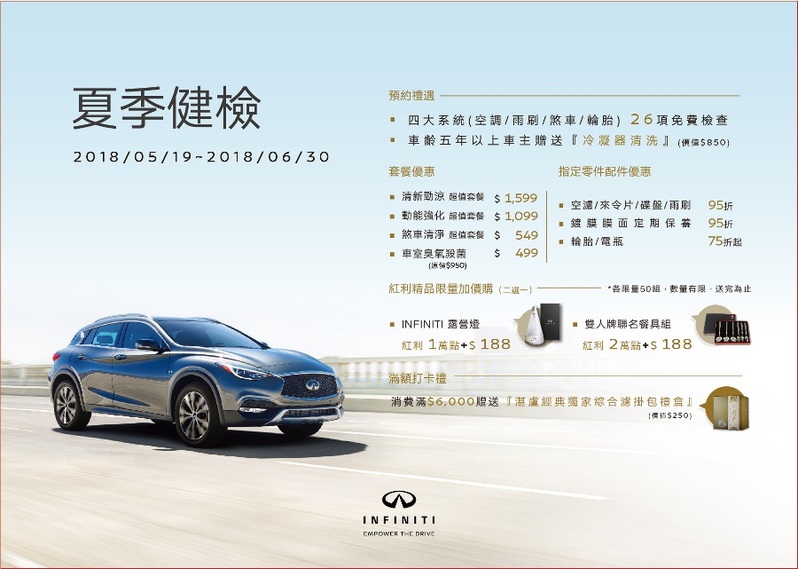 INFINITI TAIWAN自2018年5月19日至2018年6月30日止,將展開INFINITI 2018「夏季免費健檢」活動,邀請車主預約回廠免費健檢,除提供滿額打卡禮、指定套餐、零配件、輪胎及電瓶優惠外,也推出「紅利精品限量加價購」超值優惠,並針對車齡五年以上車主,回廠不限消費金額即免費享有「冷凝器清洗」禮遇,讓每位車主不論在酷夏或疾雨天候下,皆能享受暢快馳騁,沁涼舒適的熱情夏天。