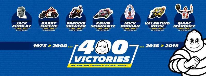 MICHELIN在開放輪胎時代與無數家輪胎廠商在最高級別競爭,直到2008年的最終站Catalunya,由Dani Pedrosa拿下勝利。MICHELIN的連勝在那之後被迫被賽會連續7年的統一輪胎規定打斷。在1973至2008年這段期間,MICHELIN在500cc/GP級距中取得驚人的73%勝率的好成績,幫助Honda, Yamaha, Suzuki, Cagiva拿下勝利,也幫助Sanvenero車手Michel Frutschi在1982年法國站拿下僅此一次的冠軍。MICHELIN的連勝在2016年回歸MotoGP成為官方指定用胎後繼續。自此之後拿下了連續40場勝利,包含Marquez在週日所取得的勝利。同時,Ducati也成為了使用MICHELIN輪胎贏得勝利的車廠之一。MICHELIN與MotoGP的合約將至少延續至2023年,因此有極高的可能性這間法國輪胎廠很快就將迎接第500次的勝利。