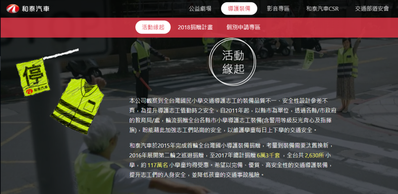 和泰汽車從事交通事業70餘年,始終秉持著「取之於社會,用之於社會」的回饋理念,致力於交通安全宣導,並為打造更安全的交通環境,盡一己之力。因觀察到全台灣國民小學交通導護志工的裝備安全款式不一、新舊參差不齊,恐在值勤時危及人身安全,和泰汽車自2011年開同業首例,展開首輪全台灣各縣市國小交通導護裝備捐贈,捐贈項目包含警用等級之反光背心及指揮旗,背心採3M光條製作,材質耐用,且反光係數高,大幅強化導護志工執勤的安全!