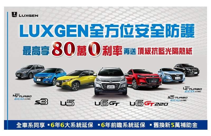 適逢端午佳節連續假期,正適合舉家同慶一同享受幸福時光,LUXGEN為讓每位車主及乘員都能遊得盡興玩的安心,特別推出「樂享。最高安全」優惠專案(1):凡於本月份入主LUXGEN車系即享最高80萬0利率(2)或超高額配件金,再享高級抗藍光隔熱紙(3)、PM2.5空調濾網4片(4)、6年6大系統及前瞻系統不限里程延長保固(5)、舊換新5萬元補助不必等(6)多項超值優惠,提供給喜愛LUXGEN的準車主們,最完善的服務品質、最安全的行車保護、最超值的優惠服務,讓你輕鬆購車免煩惱!