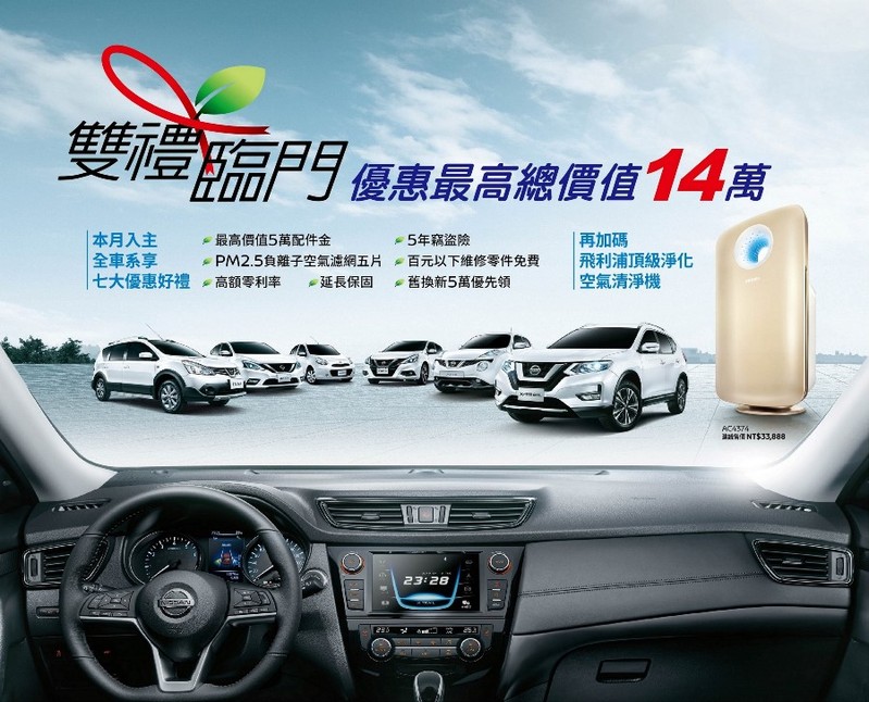 於本專案活動期間內訂購NISSAN國產全車系及JUKE之新車,完成領牌者於交車時可再獲得飛利浦頂級淨化空氣清淨機AC4374一台,數量有限,送完為止,請於NISSAN經銷公司領取以上贈品。贈品以實物為準,恕不接受更換或折抵現金,本贈品之規格與使用等相關問題請參考飛利浦官網產品介紹(https://philips.to/2KtXSw5),或逕洽飛利浦客服專線0800-231-099 (服務時間為週一至週六09:00-18:00,週日及國定假日休息),裕隆日產汽車不負任何贈品擔保責任。