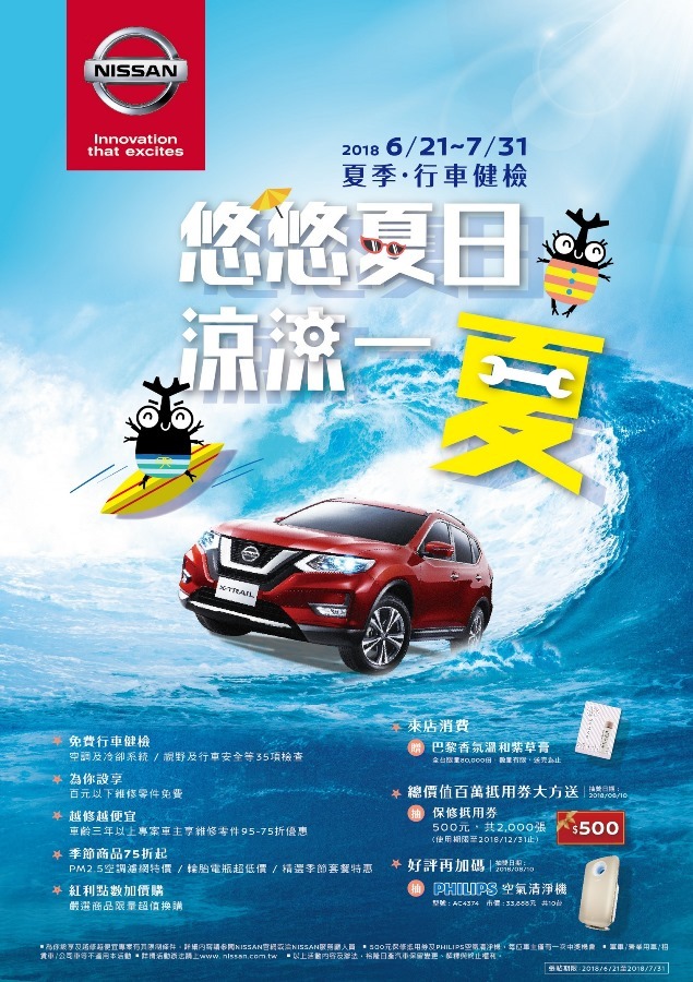 NISSAN「悠悠夏日 涼涼一夏」夏季行車健檢活動,提供愛車空調冷卻系統保養套餐優惠及火星塞、雨刷、空調濾網與輪胎電瓶等零件特惠價格。針對車齡3年以上車主,提供「越修越便宜」專案,車輛進廠即享維修零件95折至75折優惠。另提供「為你設享」百元以下維修零件免費優惠活動,以及紅利點數加價購優惠活動。為回饋長期支持愛護NISSAN的車主,活動期間回廠消費即贈送「巴黎香氛溫和紫草膏」(每位車主限領一份),還可參加飛利浦空氣清淨機(市價新台幣33,888元)及500元保修抵用券之抽獎活動,讓所有NISSAN車主同時享有最舒適的駕乘品質與最安全的行車生活。