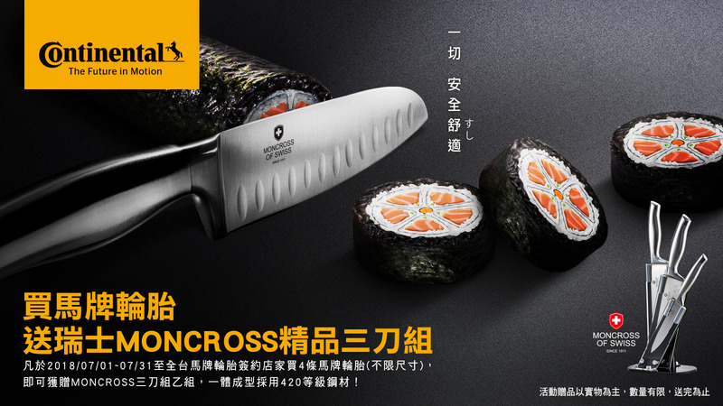 端午夏至剛過,正式迎接夏日到來,馬牌輪胎為了全家人一同歡樂出遊,和親朋好友團聚共度餐桌上的好食光,特別精挑細選出瑞士MONCROSS精品三刀組贈品。消費者凡於活動期間(2018/7/1-2018/7/31)購買4條馬牌輪胎即可獲得限量好禮。