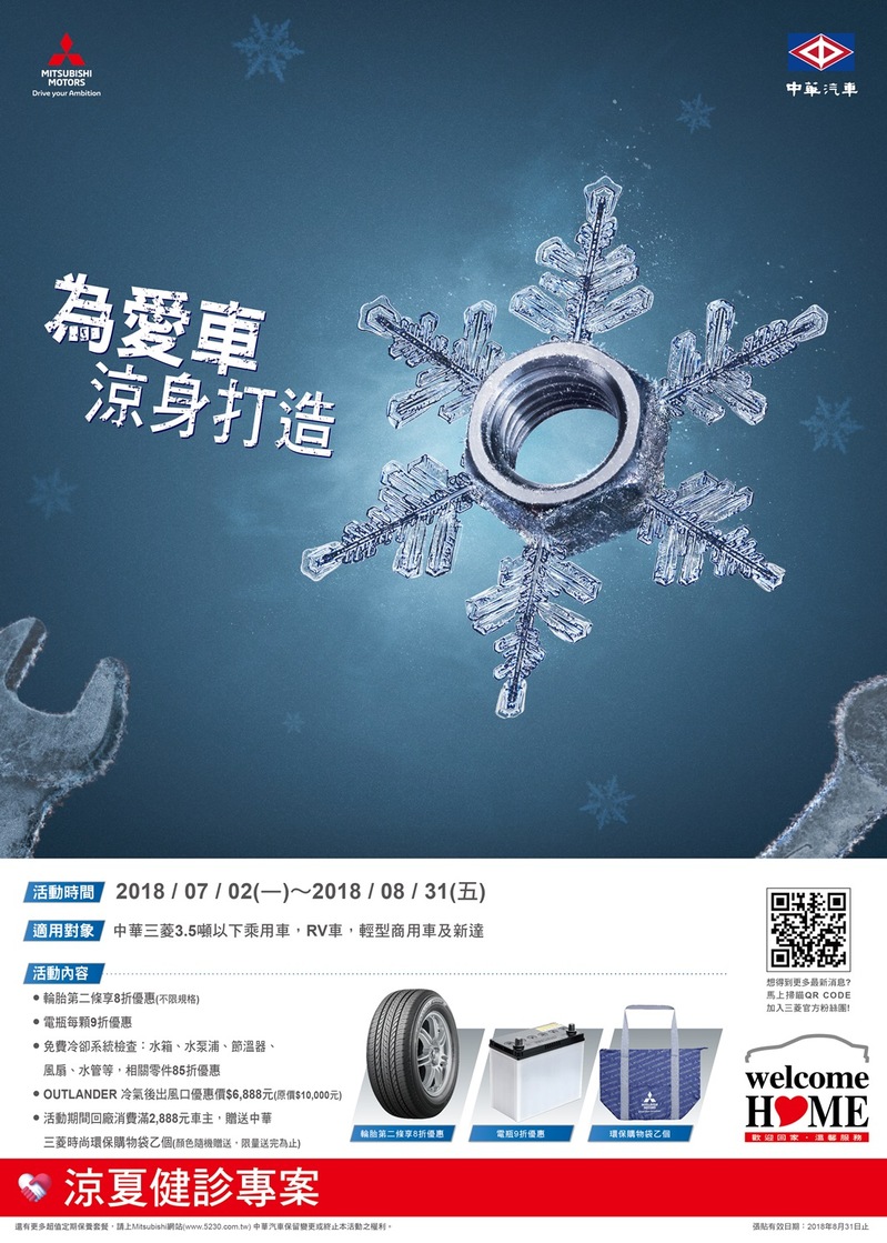 夏日出遊好時光,愛車檢查不可忘。中華三菱推出涼夏健診專案,即日起至2018年08月31日止,只要到中華三菱服務廠,免費提供專業冷卻系統、輪胎及電瓶共14項檢查,同享相關零件85折優惠、電瓶9折、輪胎第2條8折(限3.5噸(含)以下車款)等多重折扣,不只守護您的行車安全,更讓您開車時透~清~涼!