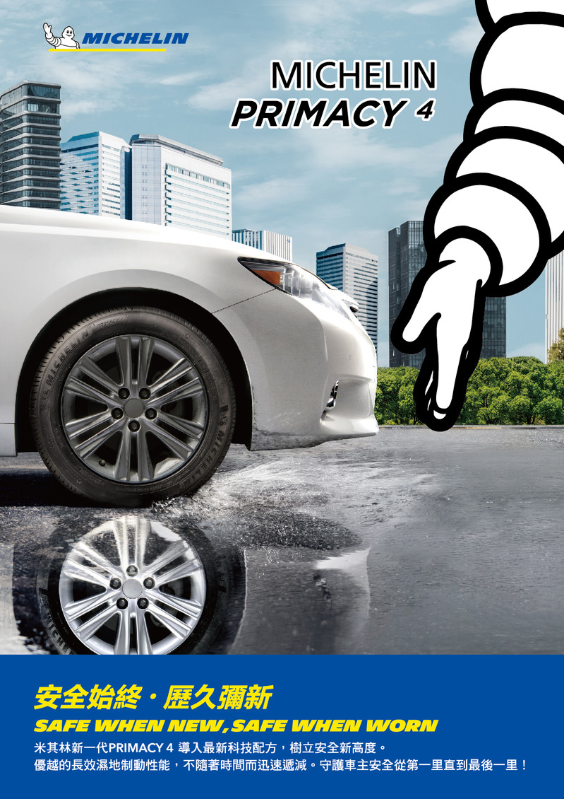 根據第三方調查,車主選購輪胎時最重視的兩大重點,分別為高安全係數及更高的使用里程。做為PRIMACY系列產品的最新力作,全新MICHELIN PRIMACY 4不僅完整承襲系列的優勢,更導入全新排水溝槽設計及高性能橡膠配方等,強調更加優異的長效濕地制動性能、安靜舒適及更高里程,無疑是同級產品中的領先者。
