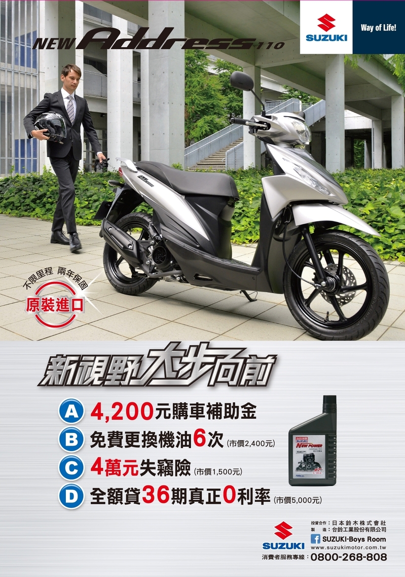 自7月起至9月底,凡購買ADDRESS 110,可享豪華四好禮,市價合計約13,000元。豪華四好禮方案包含現金購車補助4,200元、免費更換機油6次、4萬元失竊險、與全額貸36期真正0利率,同時可享政府補助汰舊換新專案。ADDRESS 110 建議售價:69,800元(含牌險)