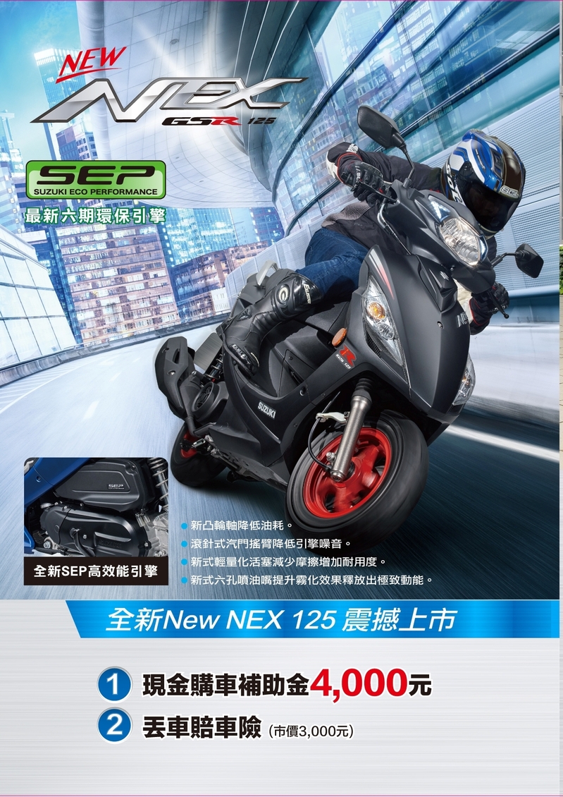 New NEX 125在外觀設計上,除俐落動感車身線條外,搭載全新六期SEP(SUZUKI