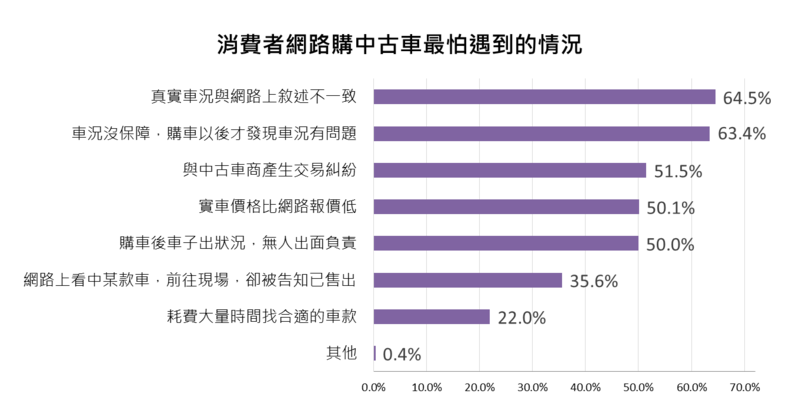 根據媒體市調*1結果指出民眾對網路購中古車最怕遇到「車況沒保障,購車以後才發現有問題」就佔了6成;其次是「與中古車商發生糾紛」、「購車後出狀況無人負責」的情況皆占5成,凸顯網路中古車交易後車況和中古車商服務品質對於消費者的重要性。