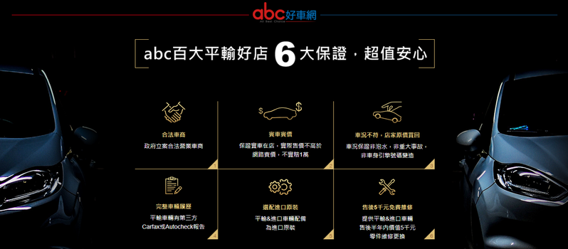 不僅如此,abc好車網針對想要購買平行輸入車又怕沒保障的消費者也有額外的保障,平行輸入車又可稱為外匯車,意思是從國外進口的中古車或里程數極低的展售車,abc好車網推出「abc百大平輸好店」,嚴格篩選平行輸入車商與車源,更保證六大承諾,abc百大平輸好店除了同步擁有上述網路好店的三大承諾外,再額外保證平行輸入車皆有完整第三方履歷、車源選配皆進口原裝,且半年售後5千元免費維修*2等安心承諾,讓民眾可以買到高CP值的平行輸入車與超放心的售前售後服務。