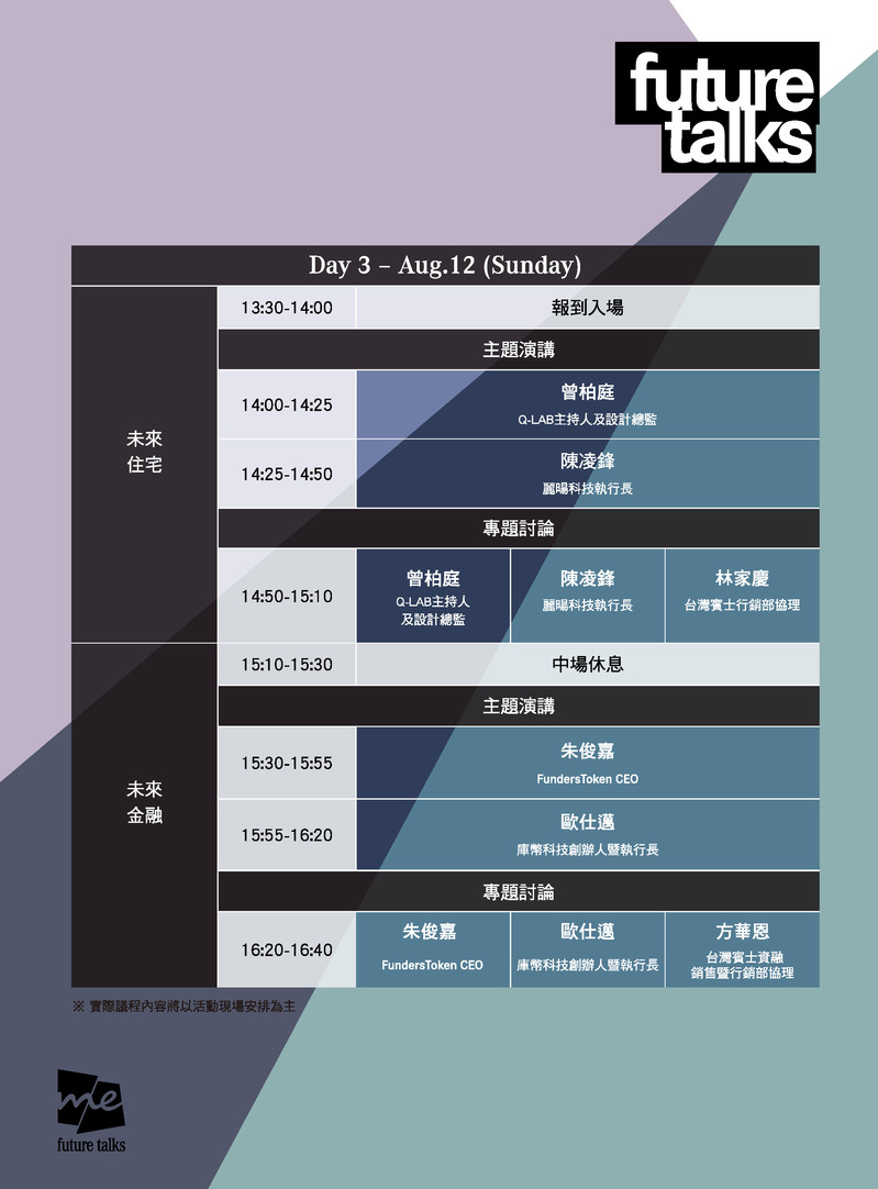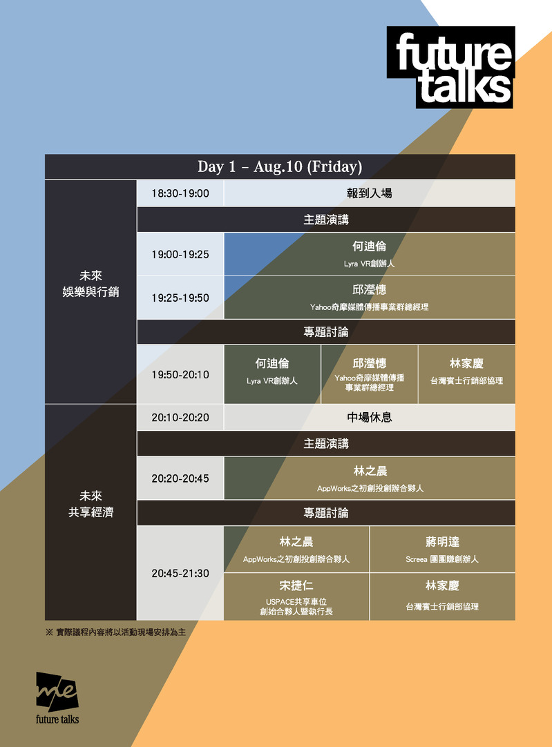 針對此六大主題,特別邀請多位意見領袖分享自身於專業領域的分析與見解,其中首先於8月10日舉辦的「未來娛樂與行銷」邀請Yahoo 奇摩媒體傳播事業群總經理邱瀅憓與Lyra VR創辦人何迪倫擔任主講者;「未來共享經濟」邀請到AppWorks之初創投創辦合夥人林之晨、Screea團團賺創辦人蔣明達與USPACE共享車位創始合夥人暨執行長宋捷仁共同商議;8月11日舉行的「未來移動」主題由NVIDIA 亞太區技術行銷總監嚴永信與台灣博世原廠汽車零件事業部總經理楊建新擔任主講者;「未來能源」由小智研發創辦人兼執行長黃謙智與天泰能源集團創辦合夥人暨執行董事陳坤宏擔綱主講;8月12日壓軸登場的「未來住宅」主題邀請Q-LAB主持人及設計總監曾柏庭、與麗暘科技執行長陳凌鋒兩位主講者;而「未來金融」主題則由FundersToken CEO朱俊嘉與庫幣科技創辦人暨執行長歐仕邁共襄盛舉。