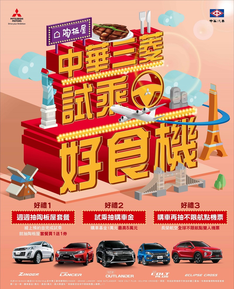 【中華三菱試乘好食機!】 凡於本月底前至中華三菱官網預約試乘COLT PLUS、NEW OUTLANDER、GRAND LANCER、ZINGER、ECLIPSE CROSS、PAJERO任一車款,試乘後至活動網站完成登錄即可參加陶板屋優惠券、購車金抽獎活動 |